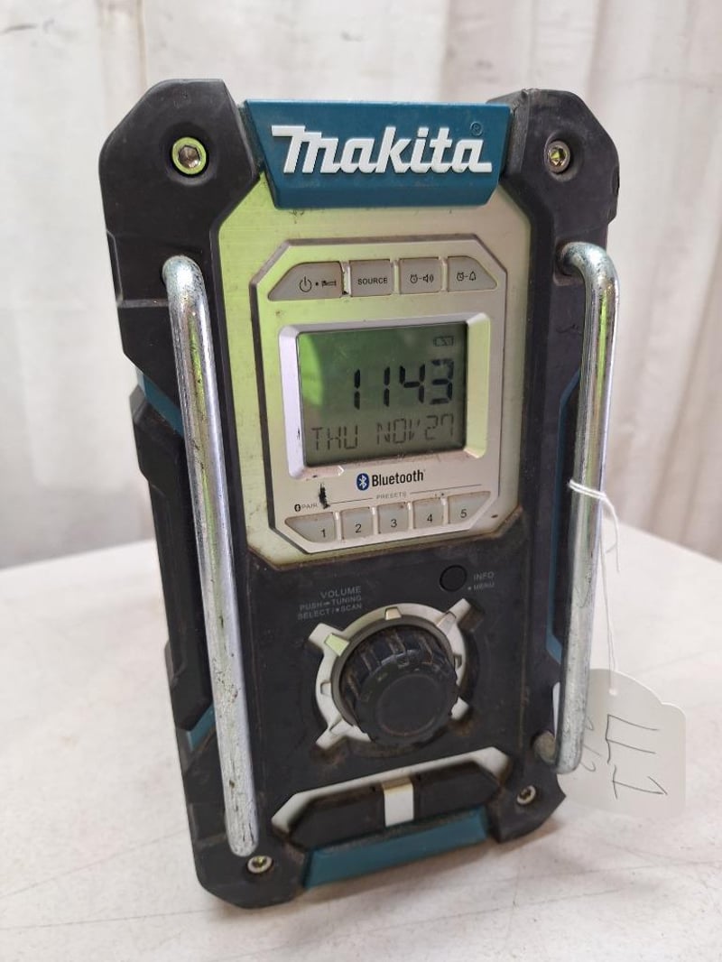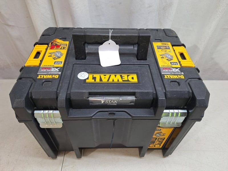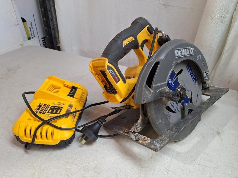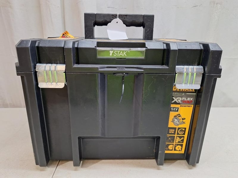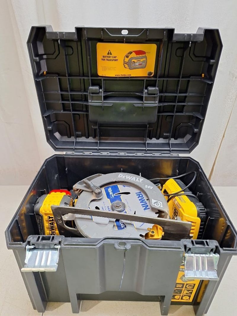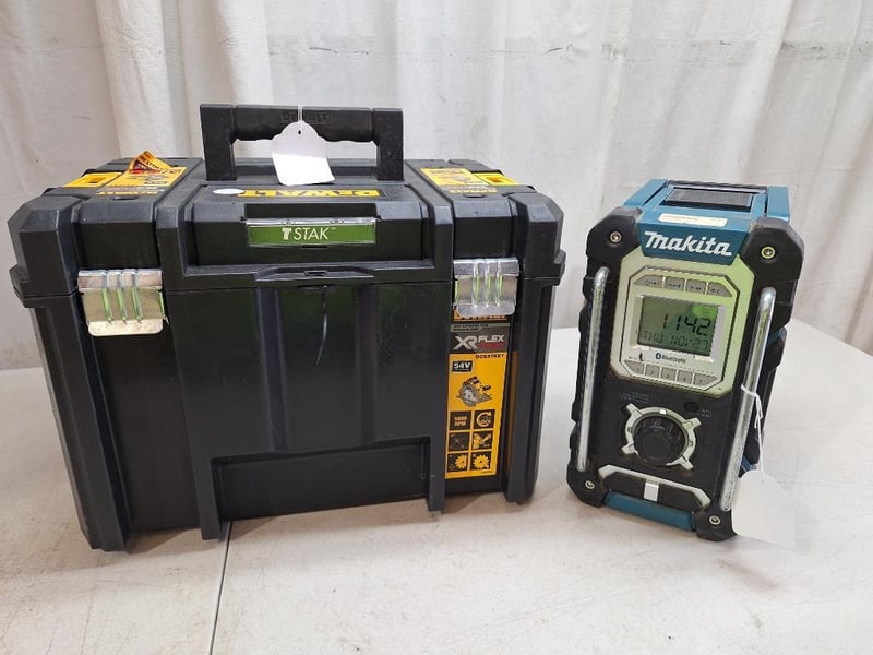 1x DEWALT 54V brushless cicular saw, DC5578X1-XE with blade,1x DEWALT 18V fast charger, model: DCB118-XE, 1x DEWALT battery 6ah, 54v, model: DCB546, 1 x DEWALT Tstak hard case with handle, l1 x MAKITA bluetooth radio, DMR108,