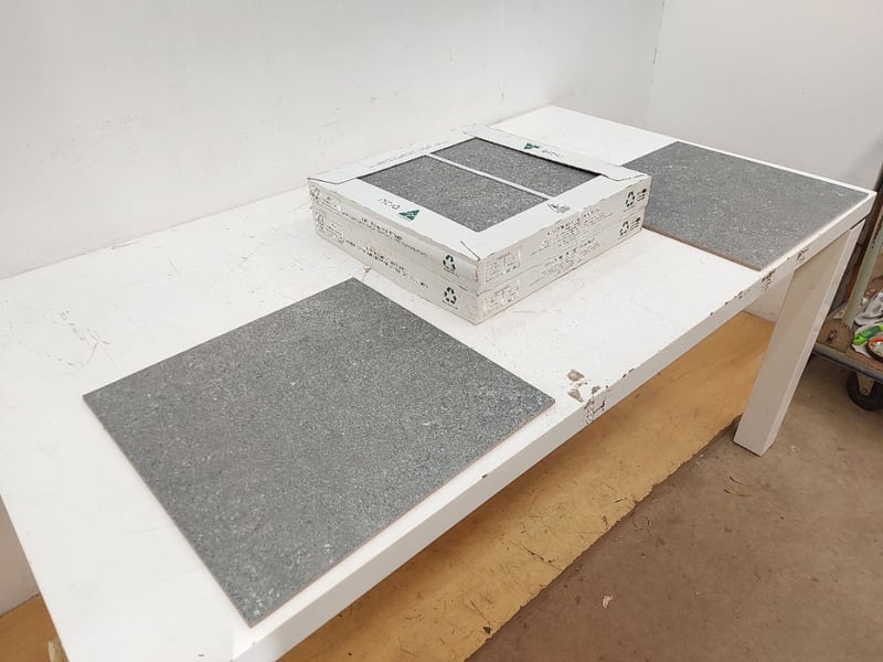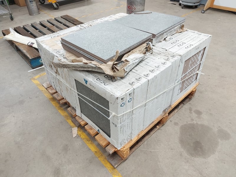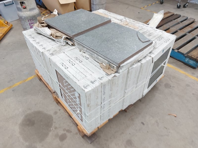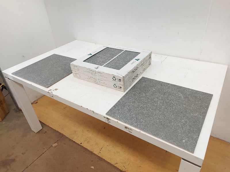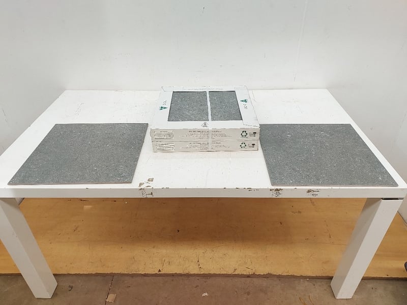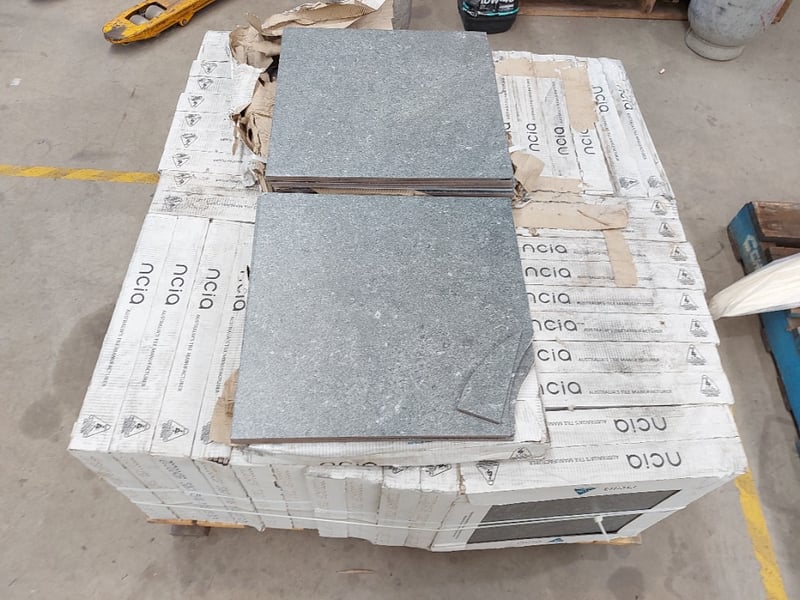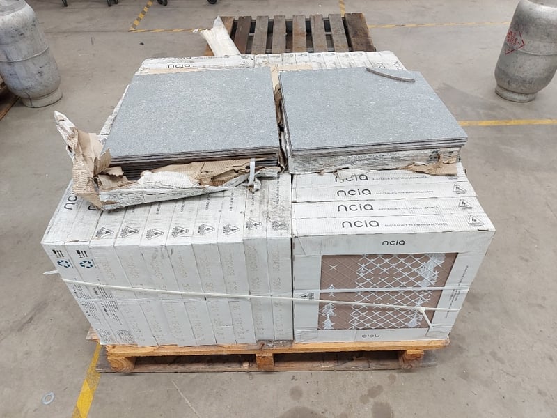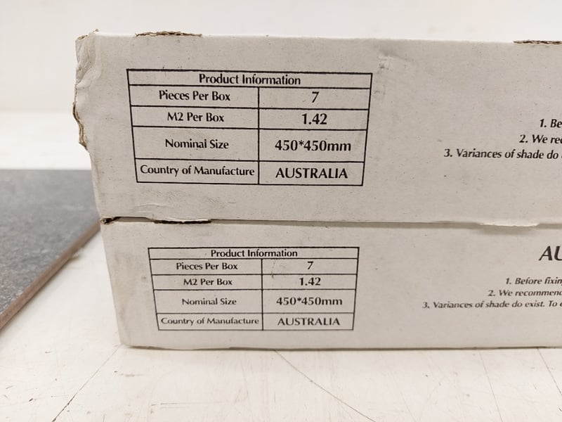 Wall and Floor Tiles, Eco Ash Matt Tiles, Ncia, Model ZC08045A, 450×450mm, Colour Dark Gray, Australian Origin, Suitable For Walls & Undercover Floors, Pieces Per Box 7, 1.42 Square Metres Per Box, 61.06 Meters, 43 Boxes, RRP$40 per Metre Squared Sold As Lot NOTE: SOME TILES MIGHT BE DAMAGED