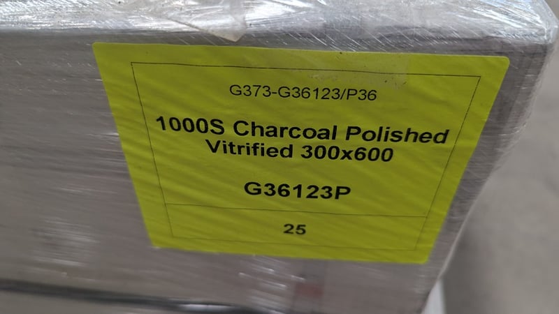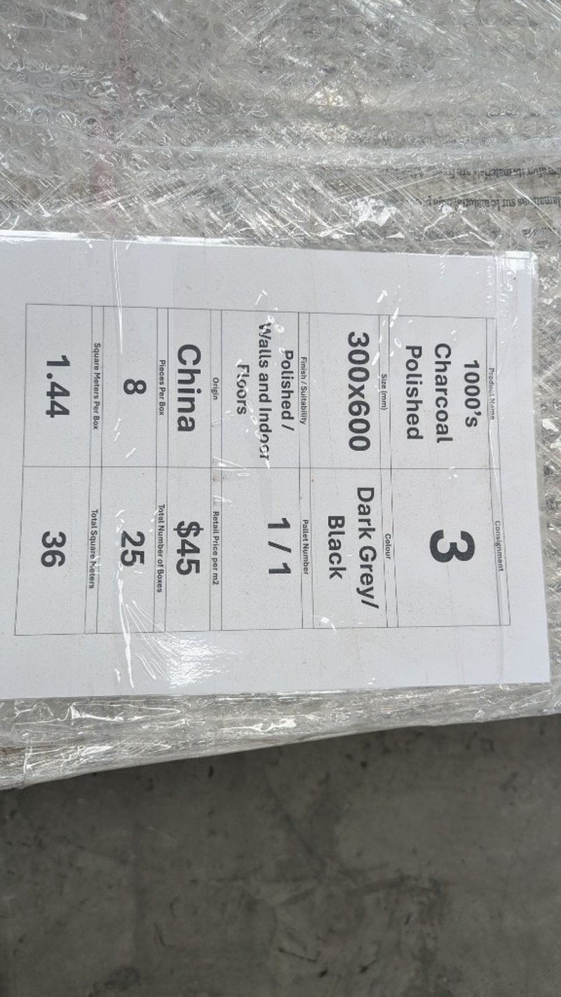 1000's Charcoal Polished Tiles, Model: G36123P, 300 × 600mm, Colour Dark Grey/Black, Suitable for Walls & Indoor Floors, Pcs Per Box 8, No of Boxes 25, Square Meters Per Box 1.44, Total Square Meters 36Note: Some Tiles May Be DamagedSold As Lot