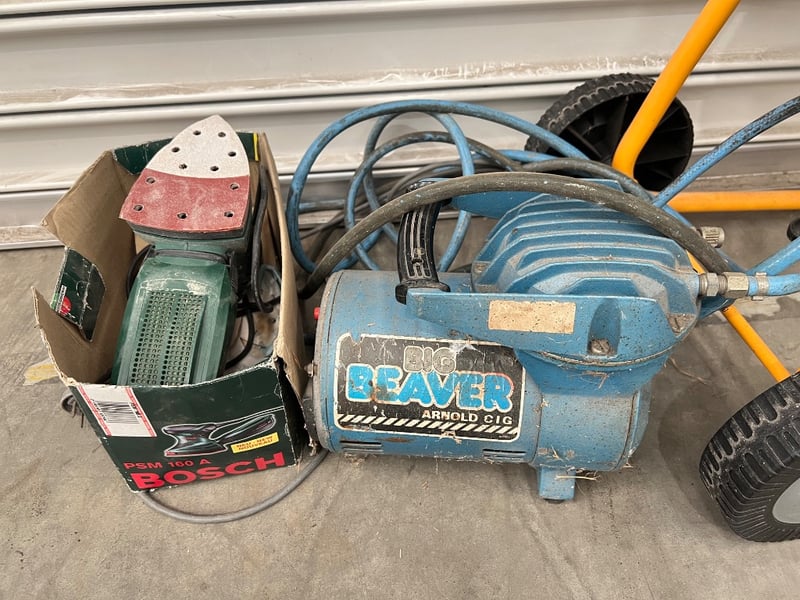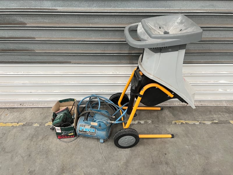 Assorted equipment, brands include; Ryobi, Bosch etc, assorted models, includes; crushing shredder, compressor, sanderSold as lot