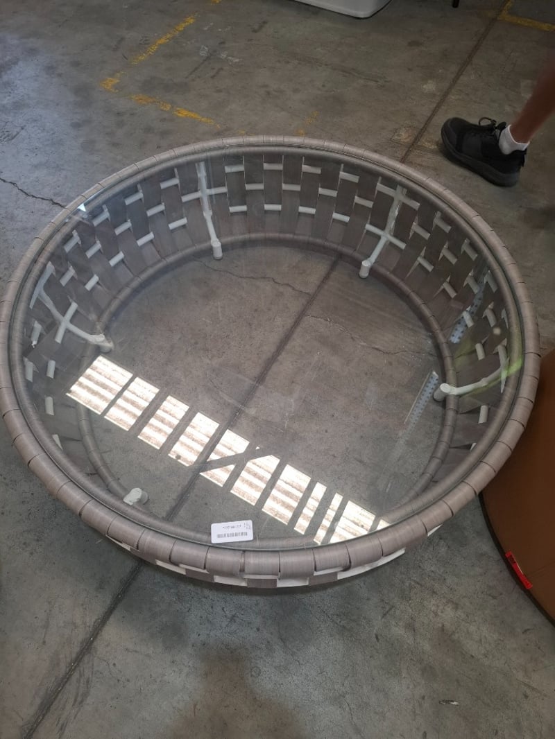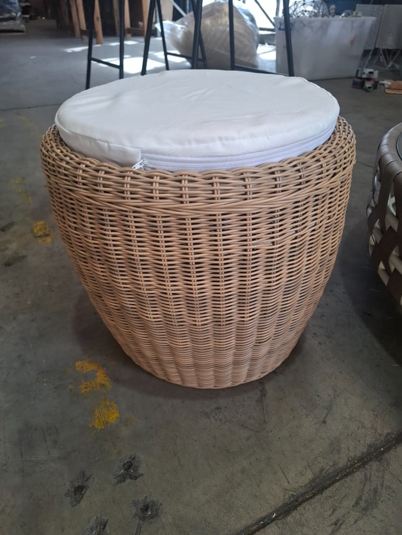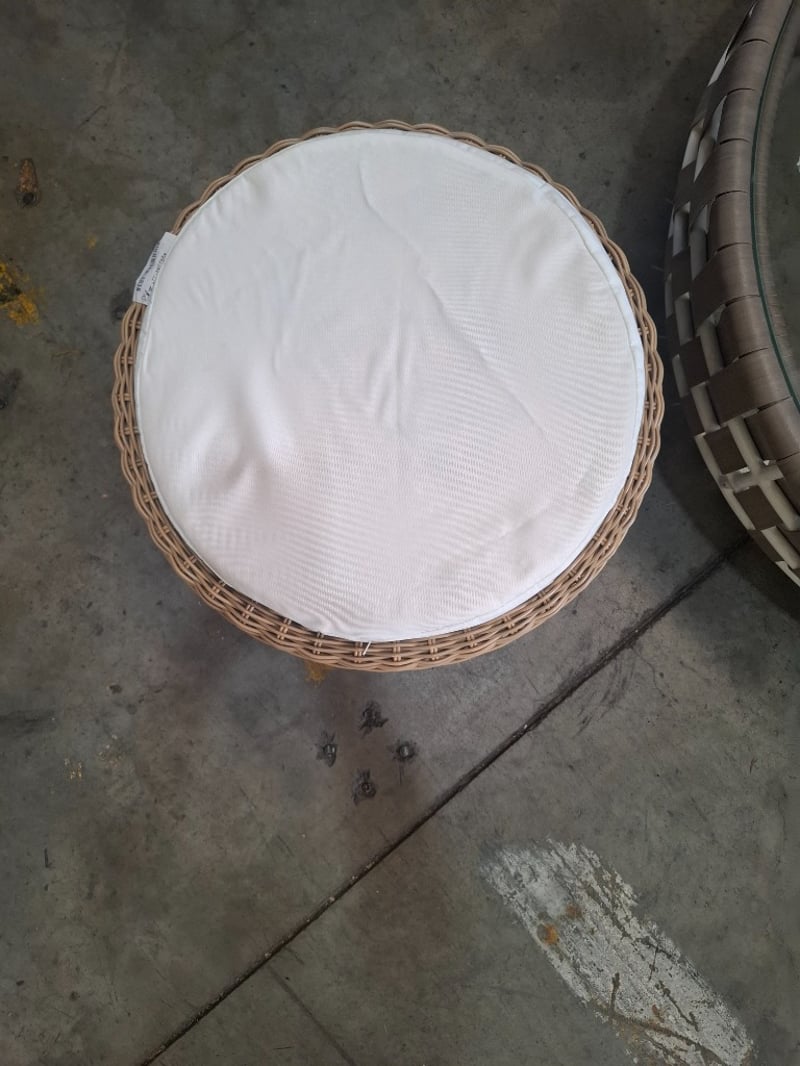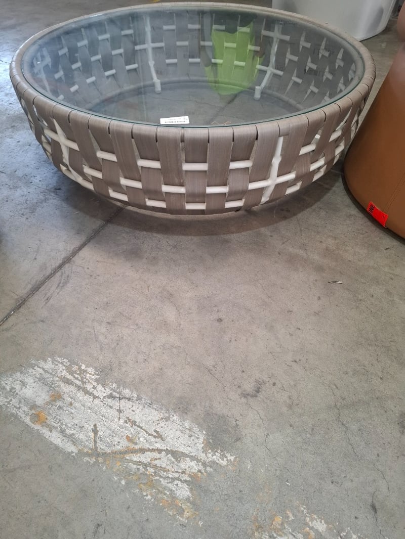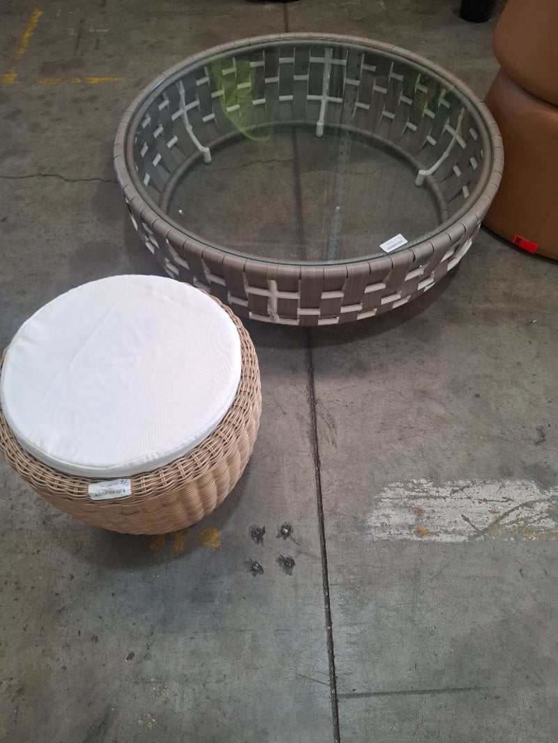 1x Strips round coffee table with a glass top and a silver walnut weave. 1x round, natural rattan footstool with a white cushion. Dimensions: 45- 104 cm(D) x 46- 30 cm (H)