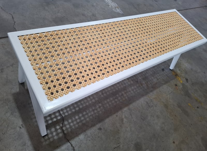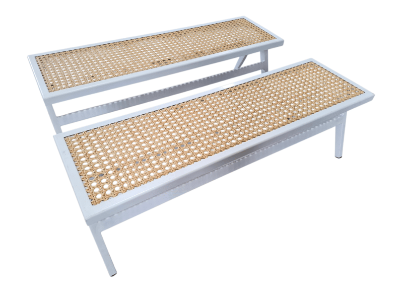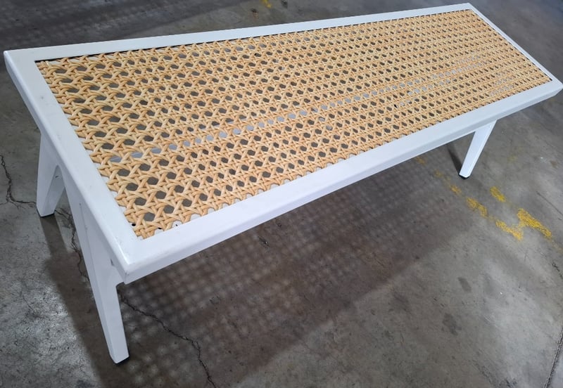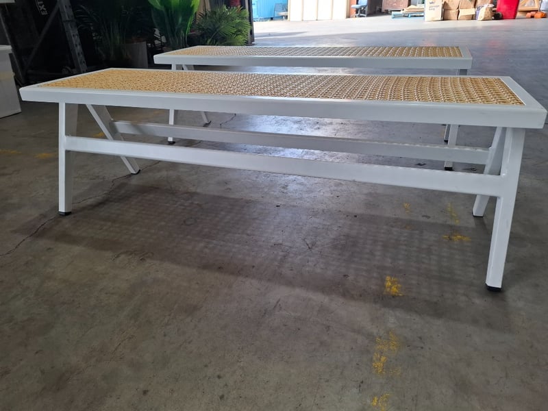 2 x white metal and natural rattan bench seat Dimensions: 137cm(W) x 41cm(D) x 44cm(H) Note: minor wear