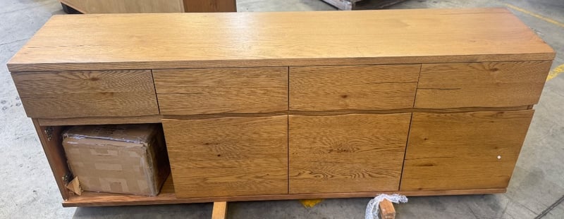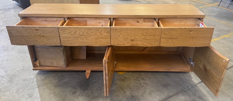 Timber buffet Dimensions: 180cm ( W) x 38cm ( D) x 73cm ( H)Note: Inspection recommended, wear and tare, missing legs, and missing cupboard