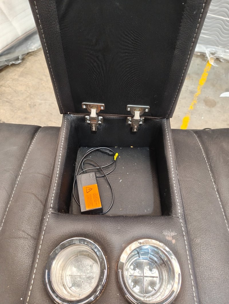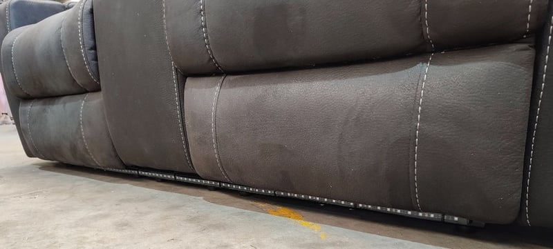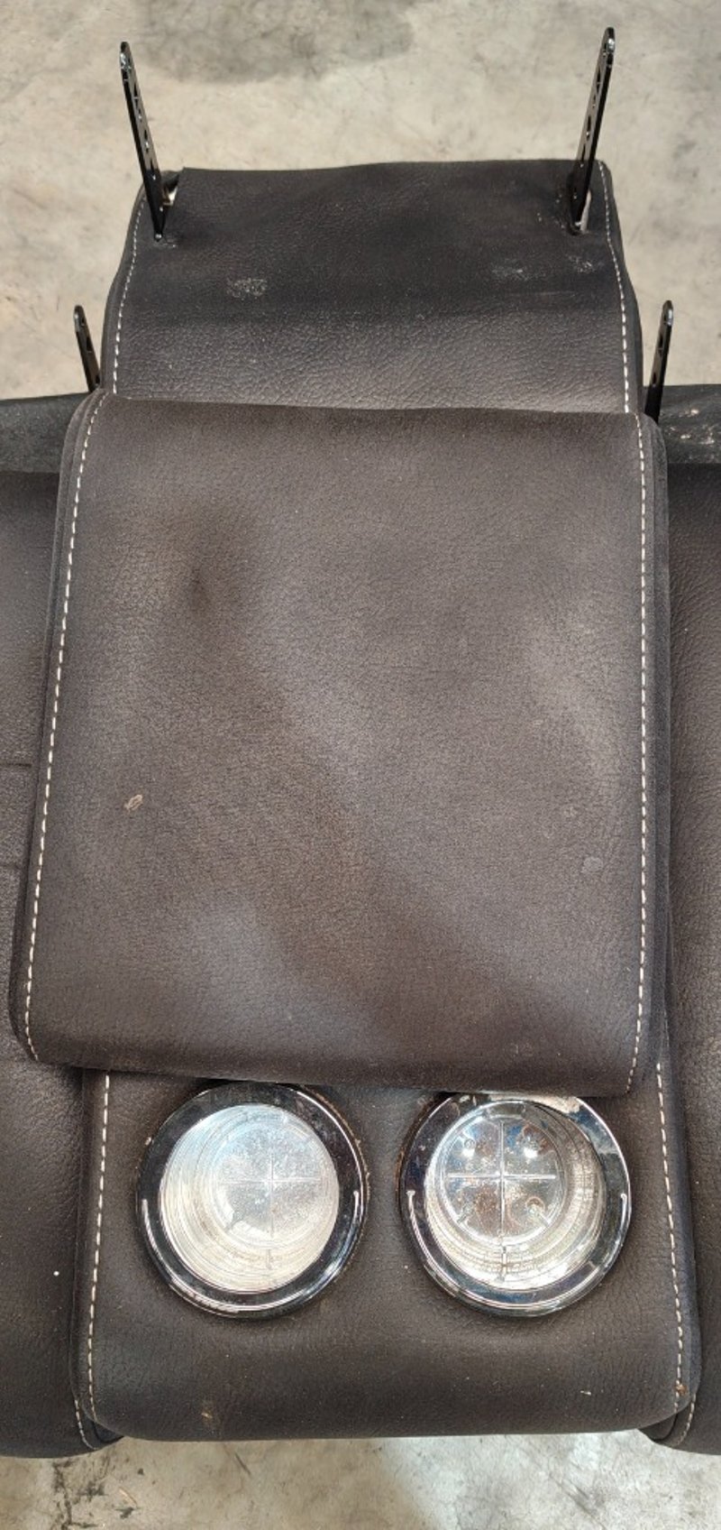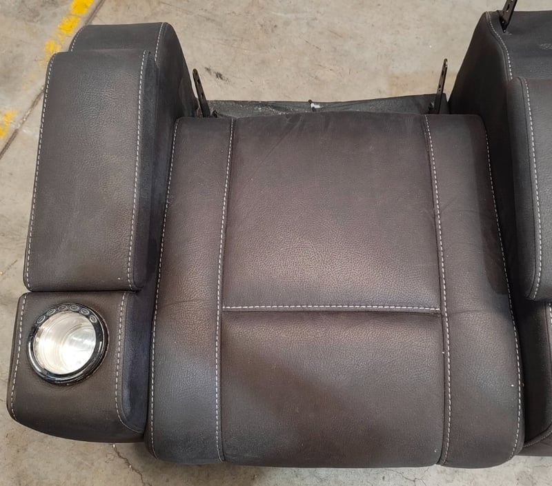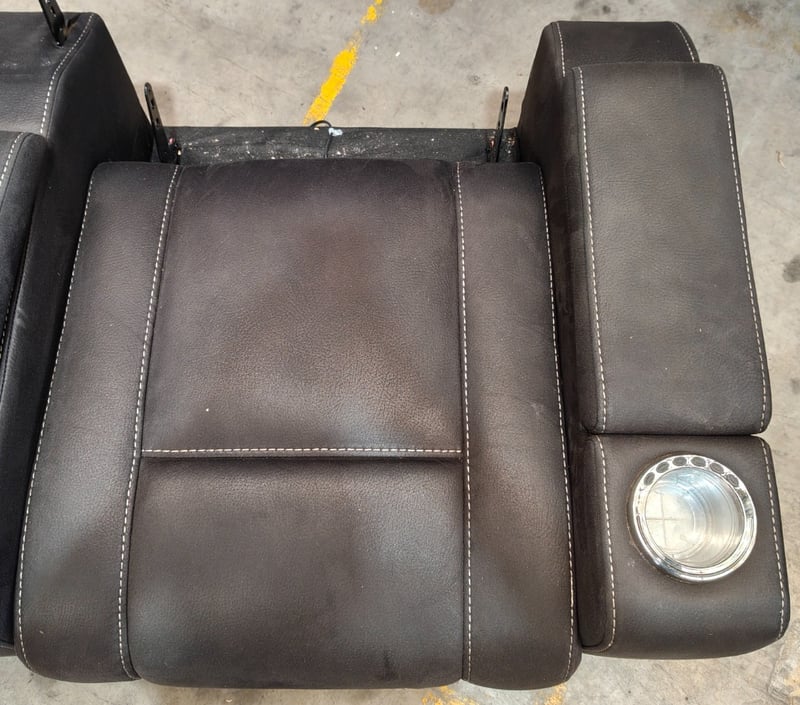 Black leather style double electrical recliner, 2 x gas storage compartments, 4 x cup holders. Dimensions: 180cm (W) x 75cm (D) x 63cm (H) Note: headrests and armrests of couch are not with product, Cleaning required, Inspection recommended, Stains, wear and tear
