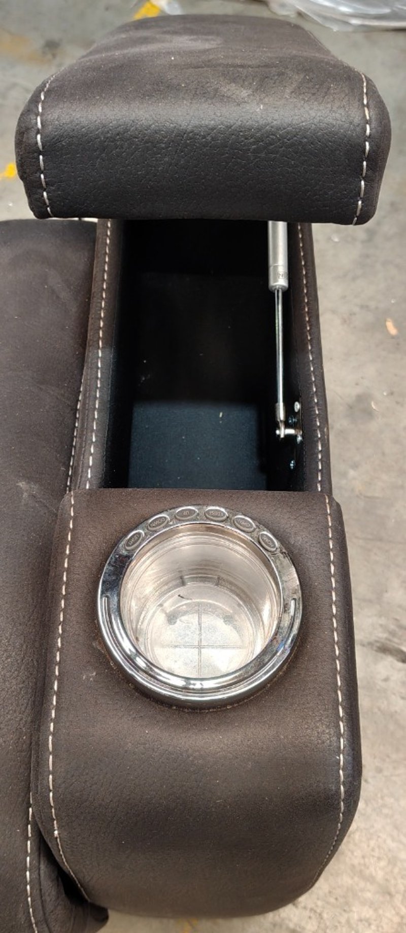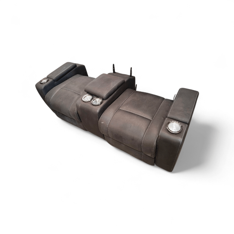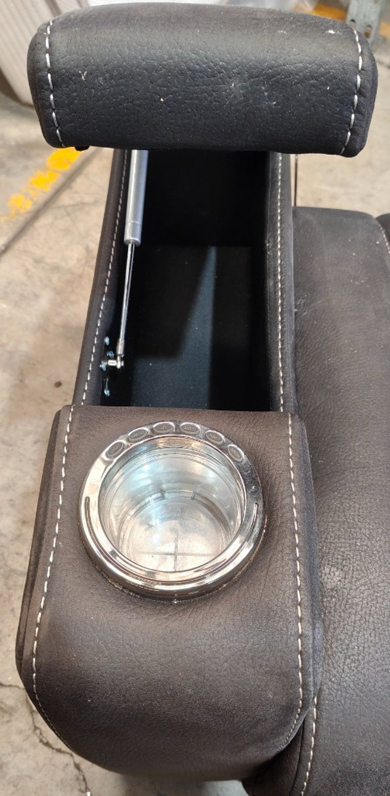 Black leather style double electrical recliner, 2 x gas storage compartments, 4 x cup holders. Dimensions: 180cm (W) x 75cm (D) x 63cm (H) Note: headrests and armrests of couch are not with product, Cleaning required, Inspection recommended, Stains, wear and tear