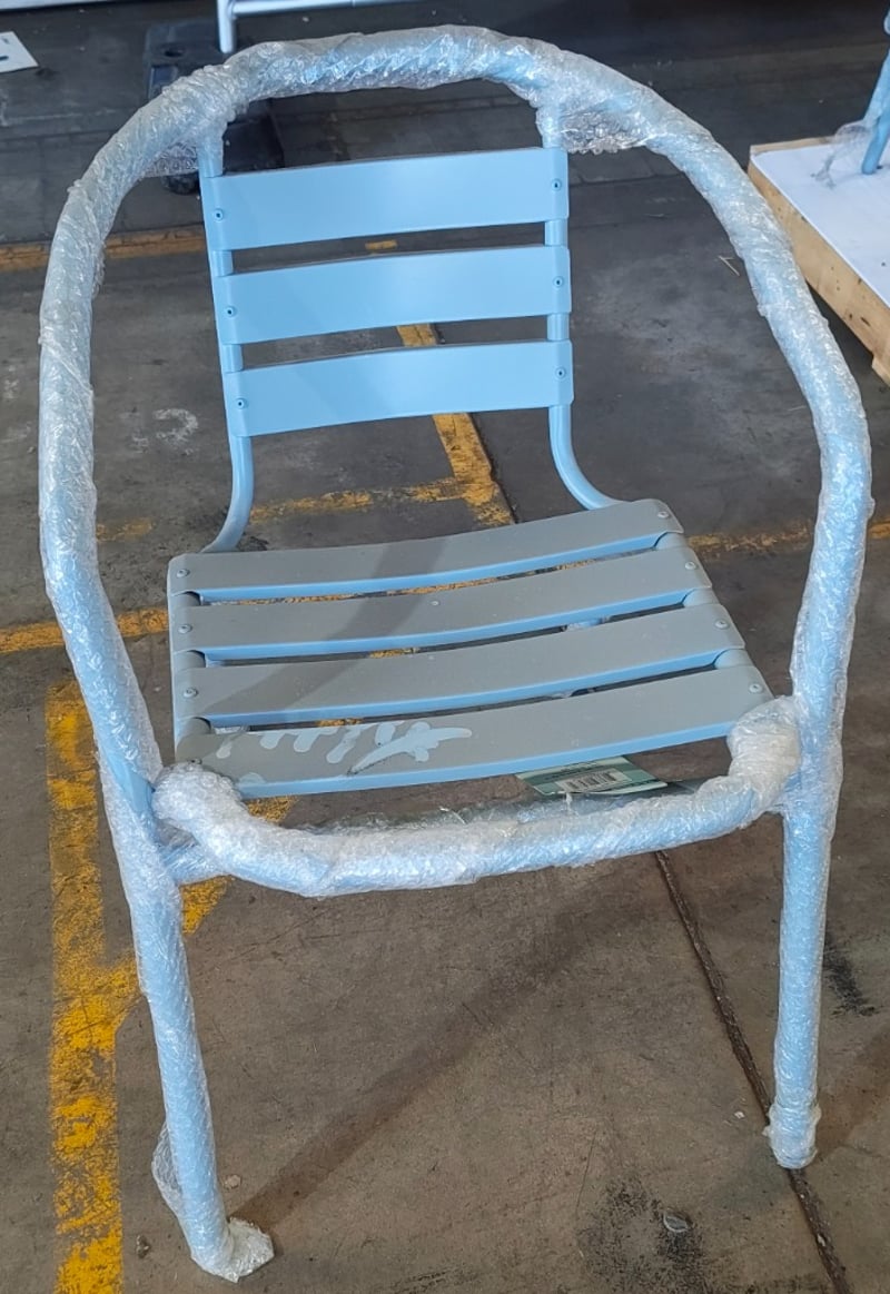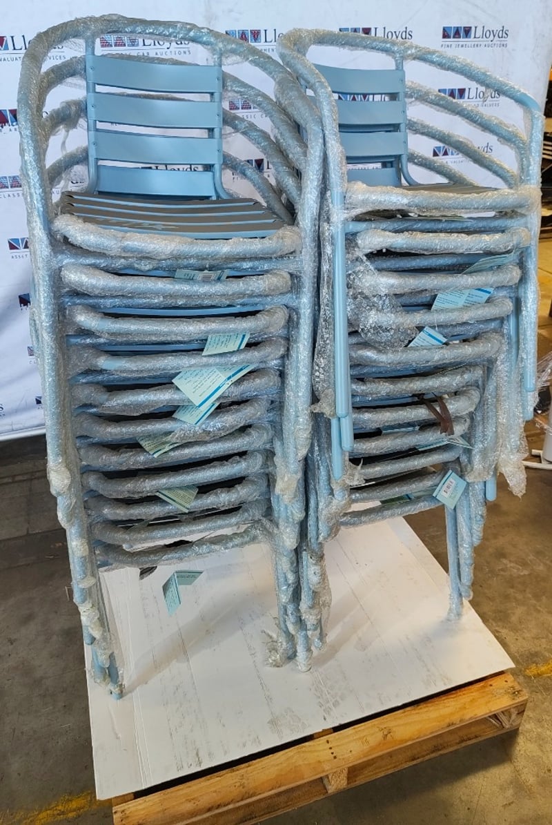 Assorted lot of blue steel café chairsQTY: 22Note: minor scratches and dents, cleaning required, inspection recommendedSold as lot