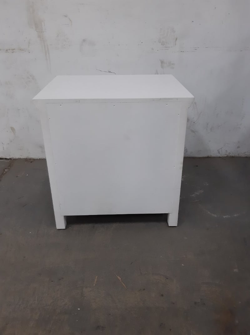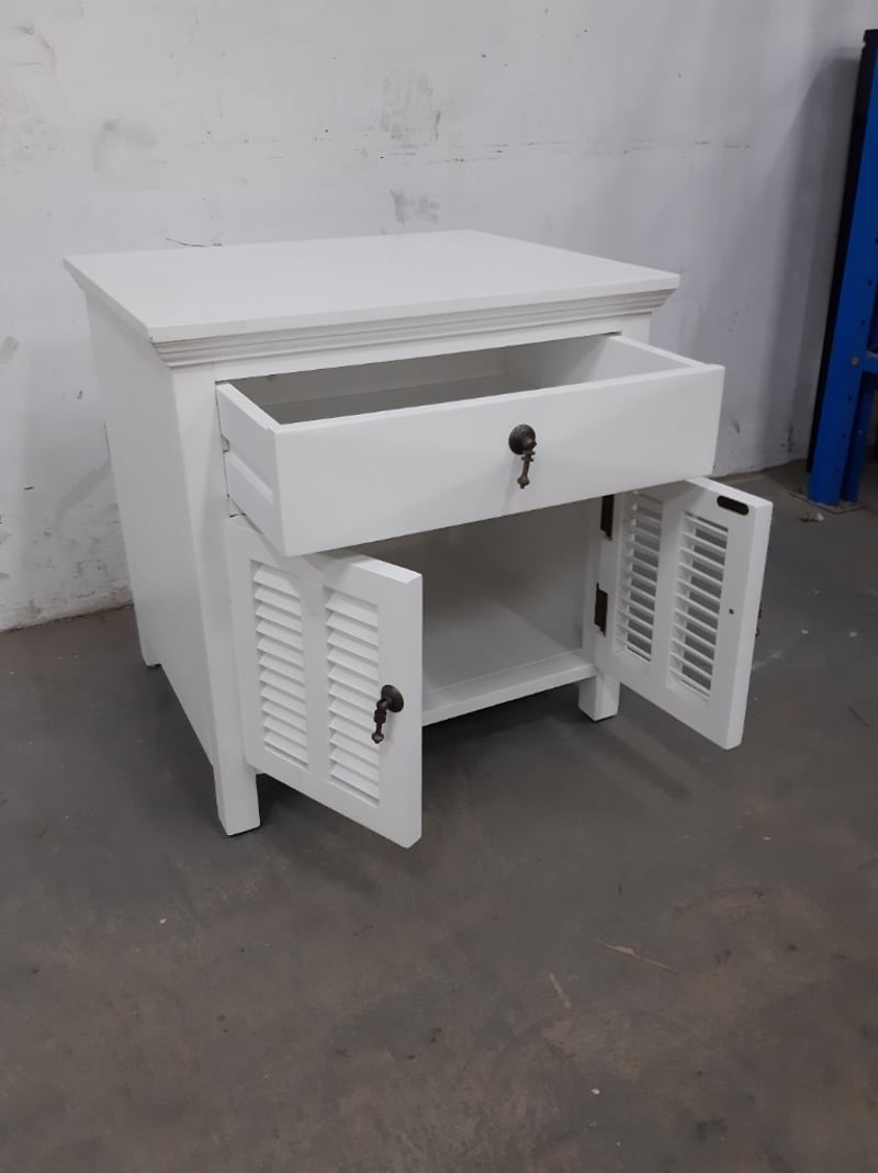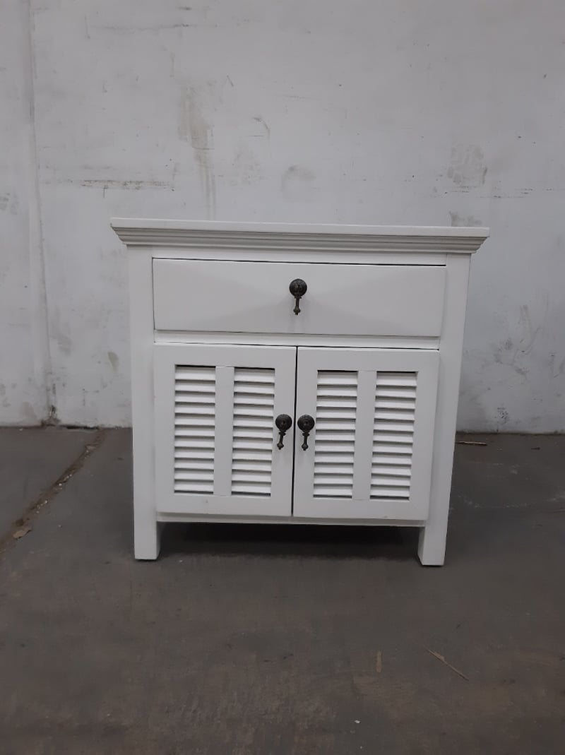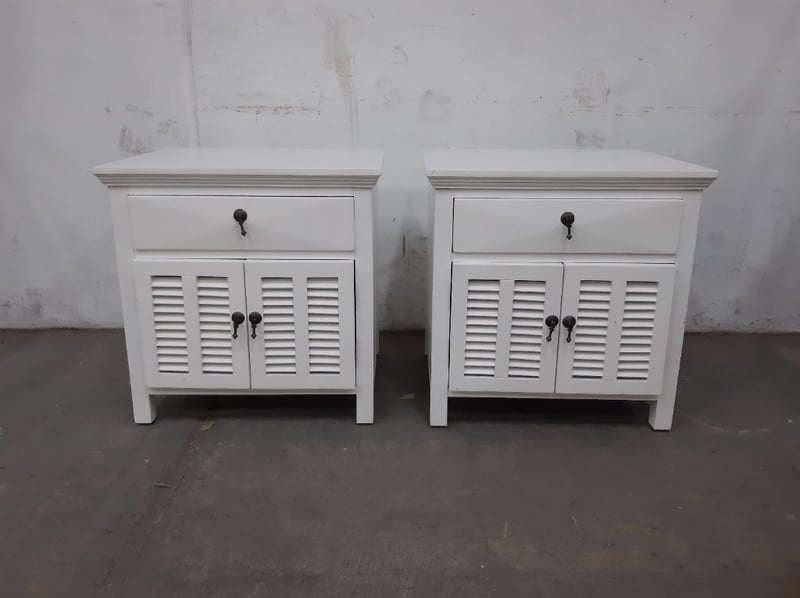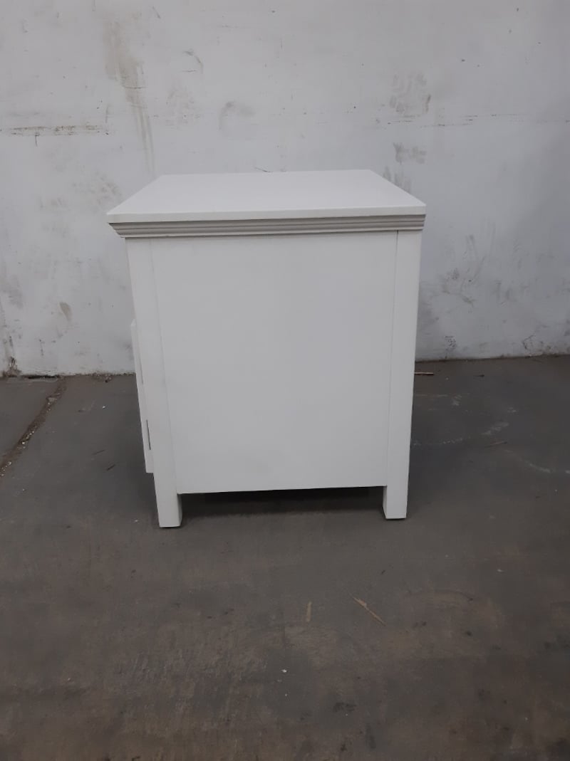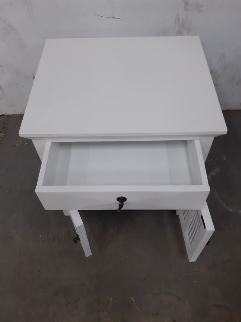 2 x side tables, Timber Style, finished in white, 1 drawer and 2 cupboard doors.Dimensions: H60 x W60 x D50BID PER EACH, MUST TAKE 2