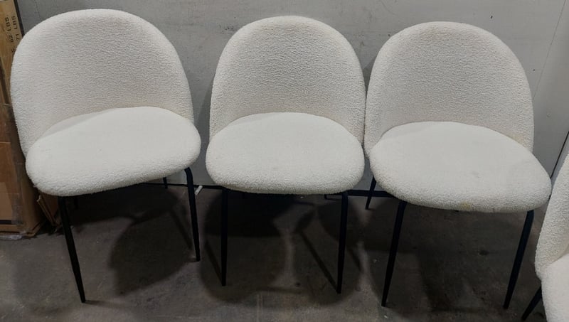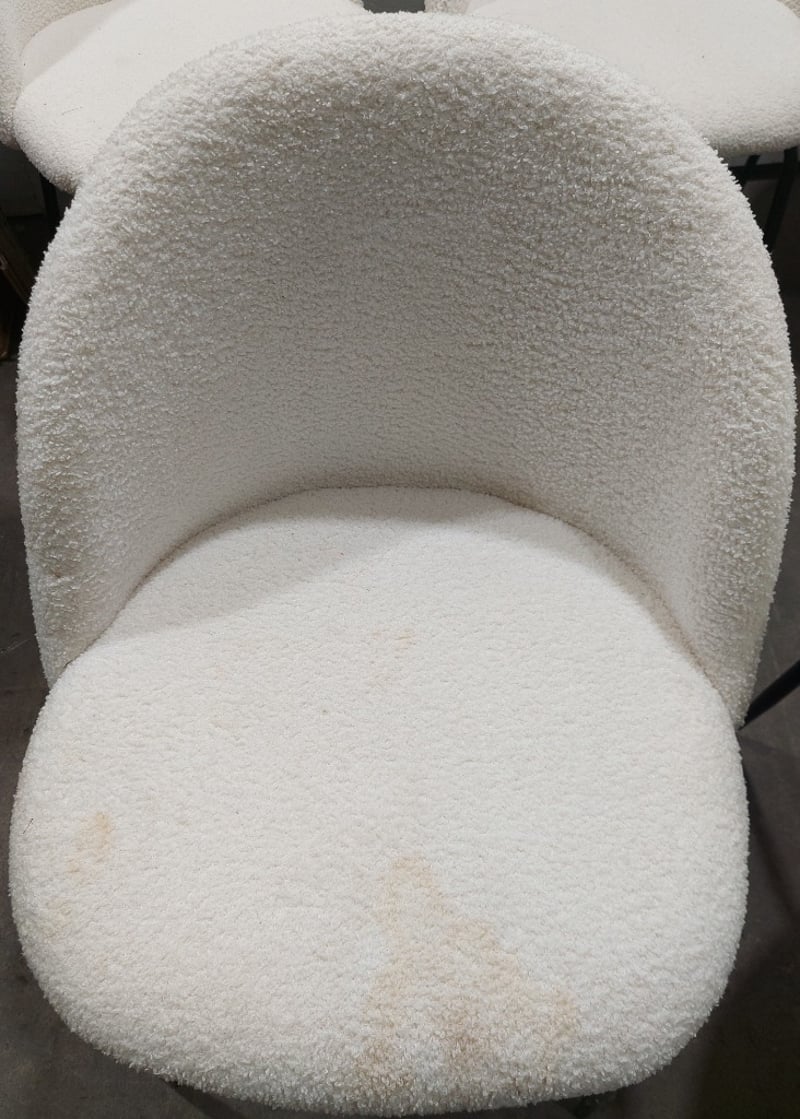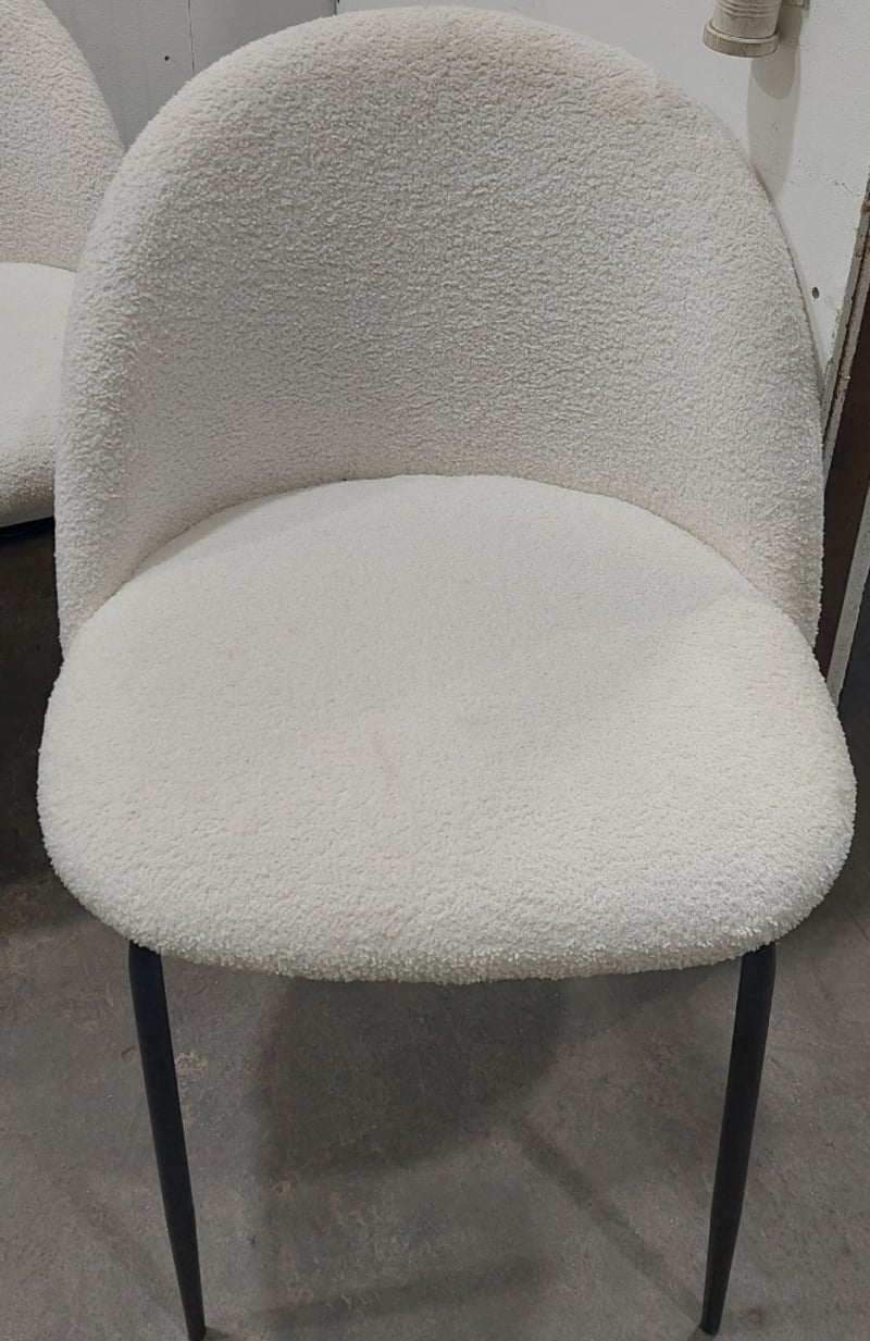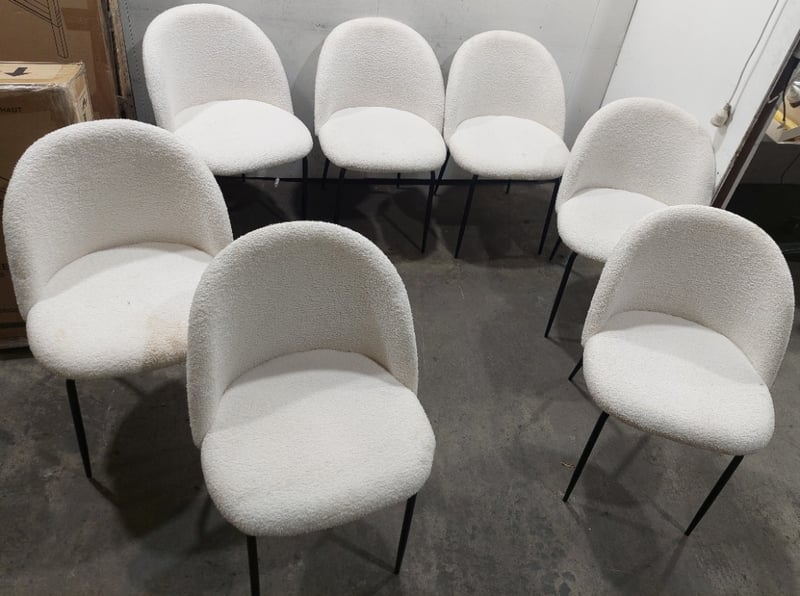 White boucle dining chairs.Qty: 7Sold as a lot.Note: signs of wear.