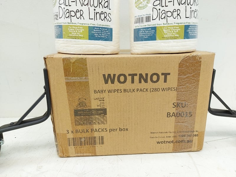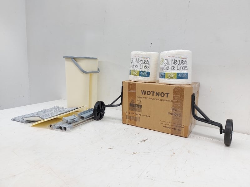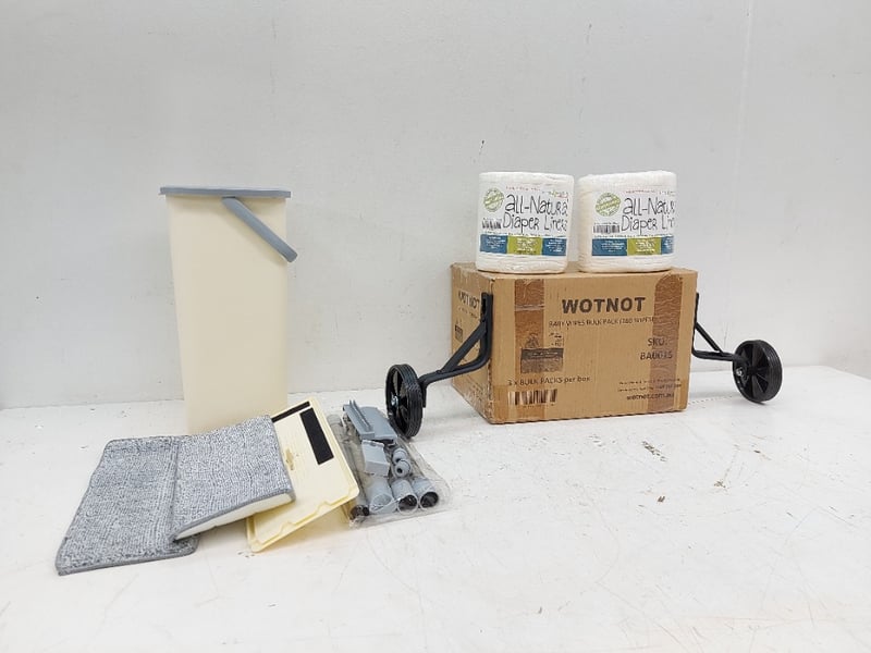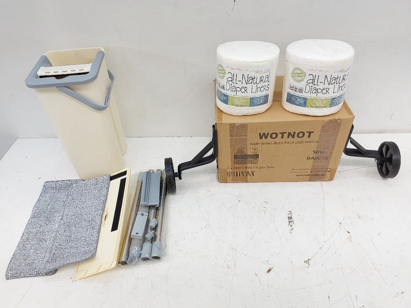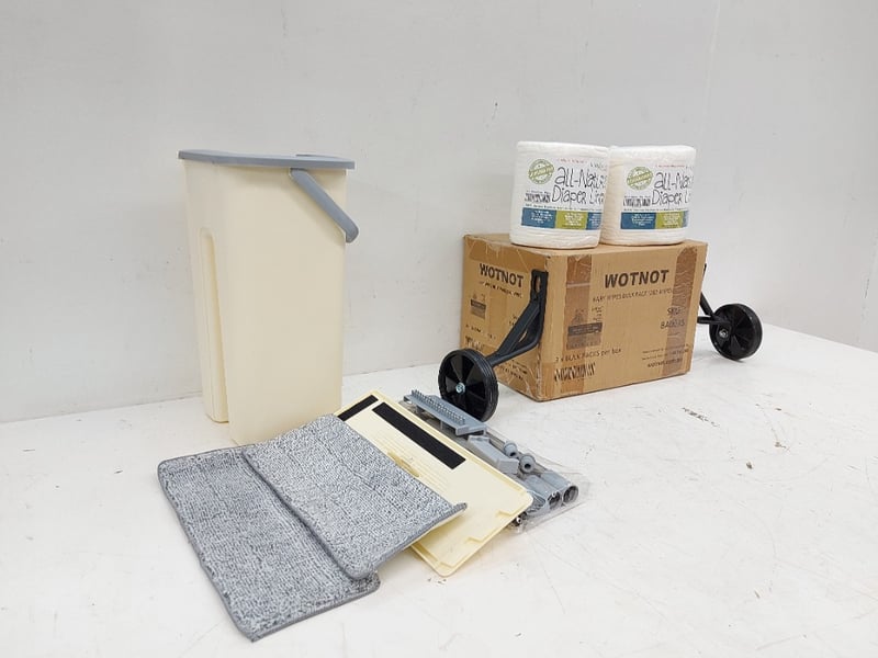 Assorted Lot Includes: Cleaning Mop And Bucket, All-Natural Diaper Liners, Baby Wipes Bulk Pack, 280 Wipes, 3 Bulk Packs Per Box, Wotnot, and More, Quantity 4