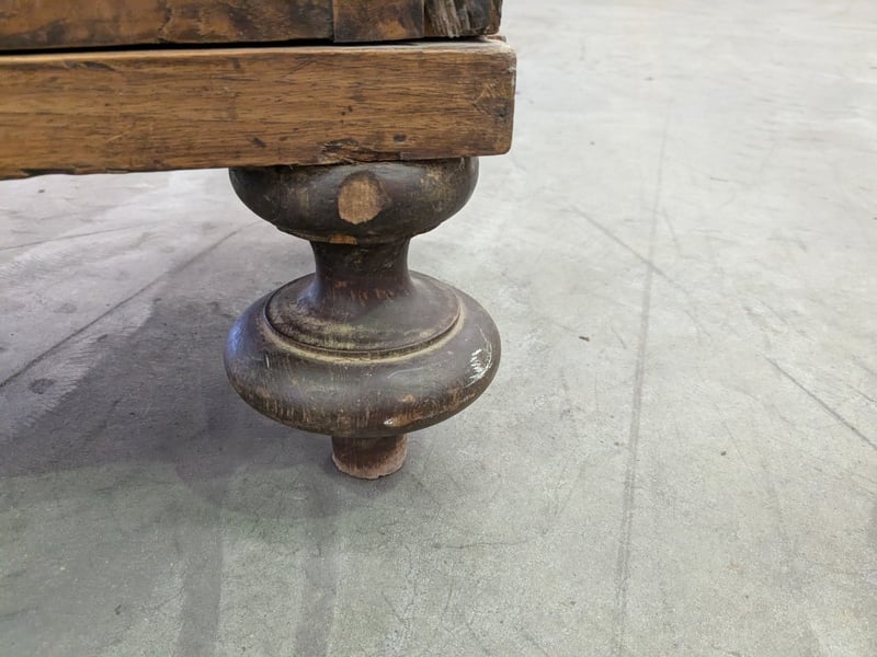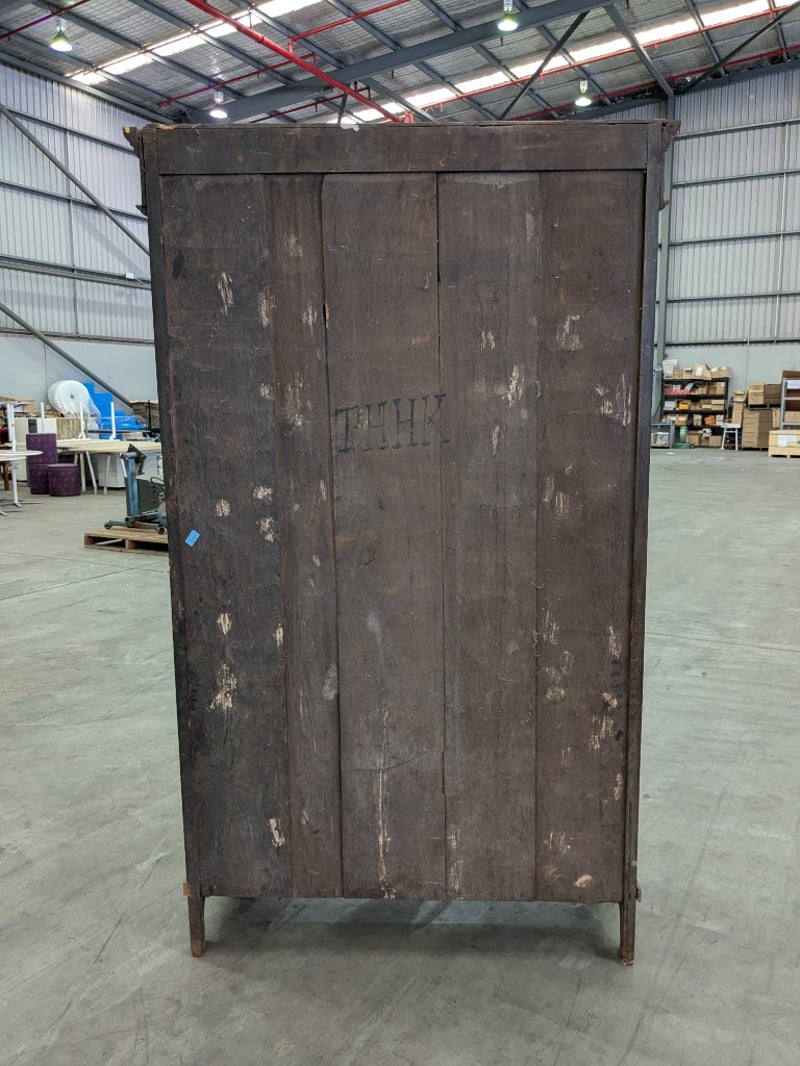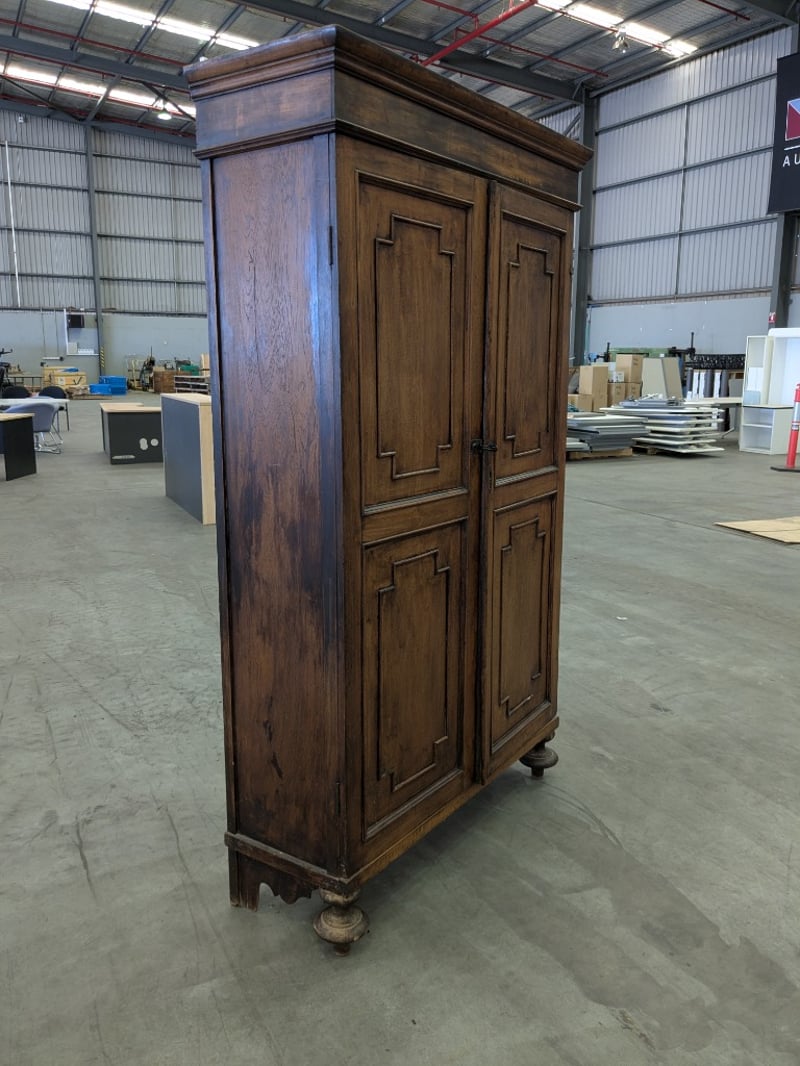 Wooden Wardrobe / Storage Cabinet – Aged Timber Style, Panelled DoorsBeautiful wooden wardrobe featuring classic panelled double doors, original metal hardware, internal shelving, and traditional turned timber feet. A character-filled piece with a rustic, aged patina.Dimensions:(W) 121 cm x (H) 212 cm x (D) 41 cmNote: Shows wear consistent with age, Visible damage and water staining to the top and rear panels, Structural integrity appears fair, but restoration may be required. Sold as-is.