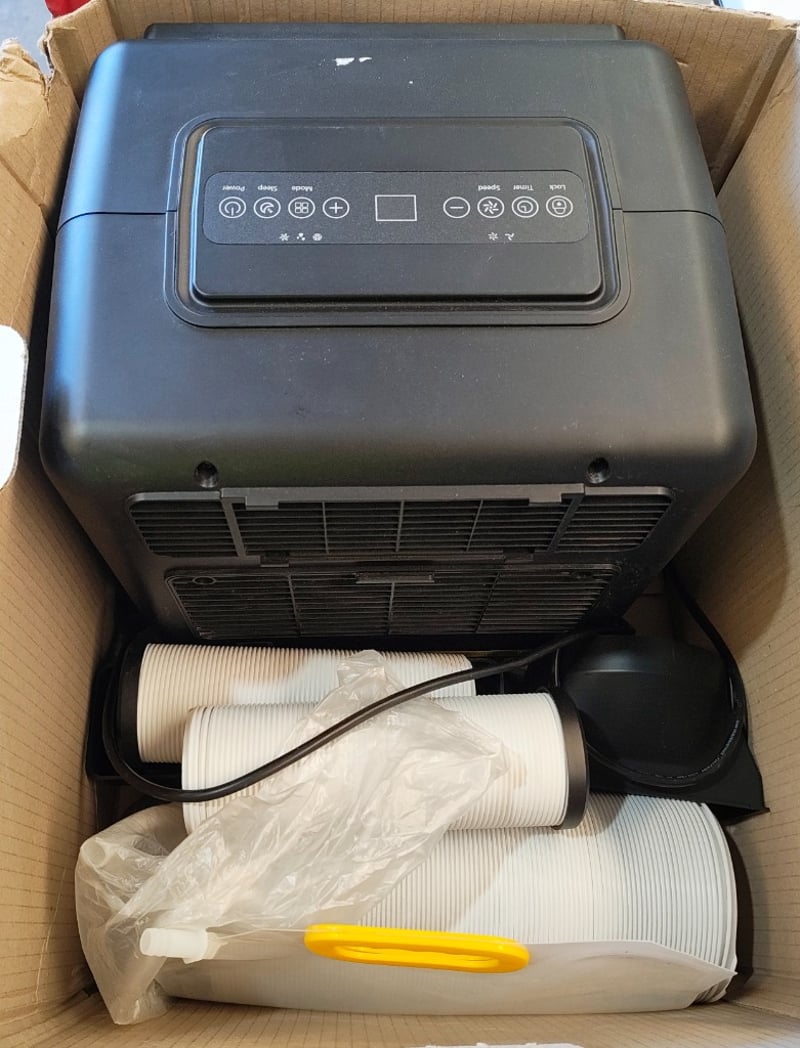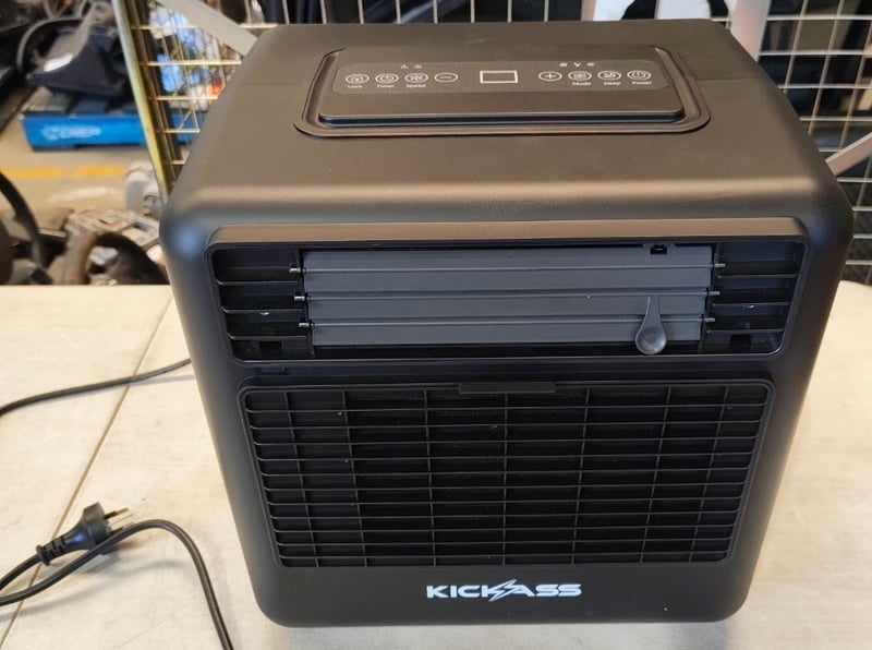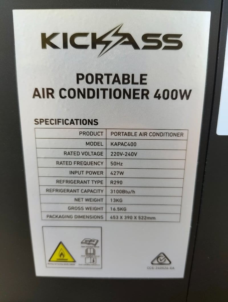 RRP $699.95 KickAss 400W Portable Air Conditioner Dimensions: 45cm (H) x 41cm (W) x 52cm (D) Note: working condition unknown, minor marks and dents, inspection recommended, parts missing