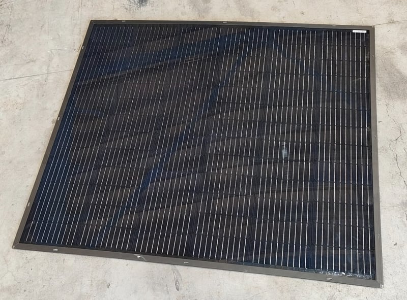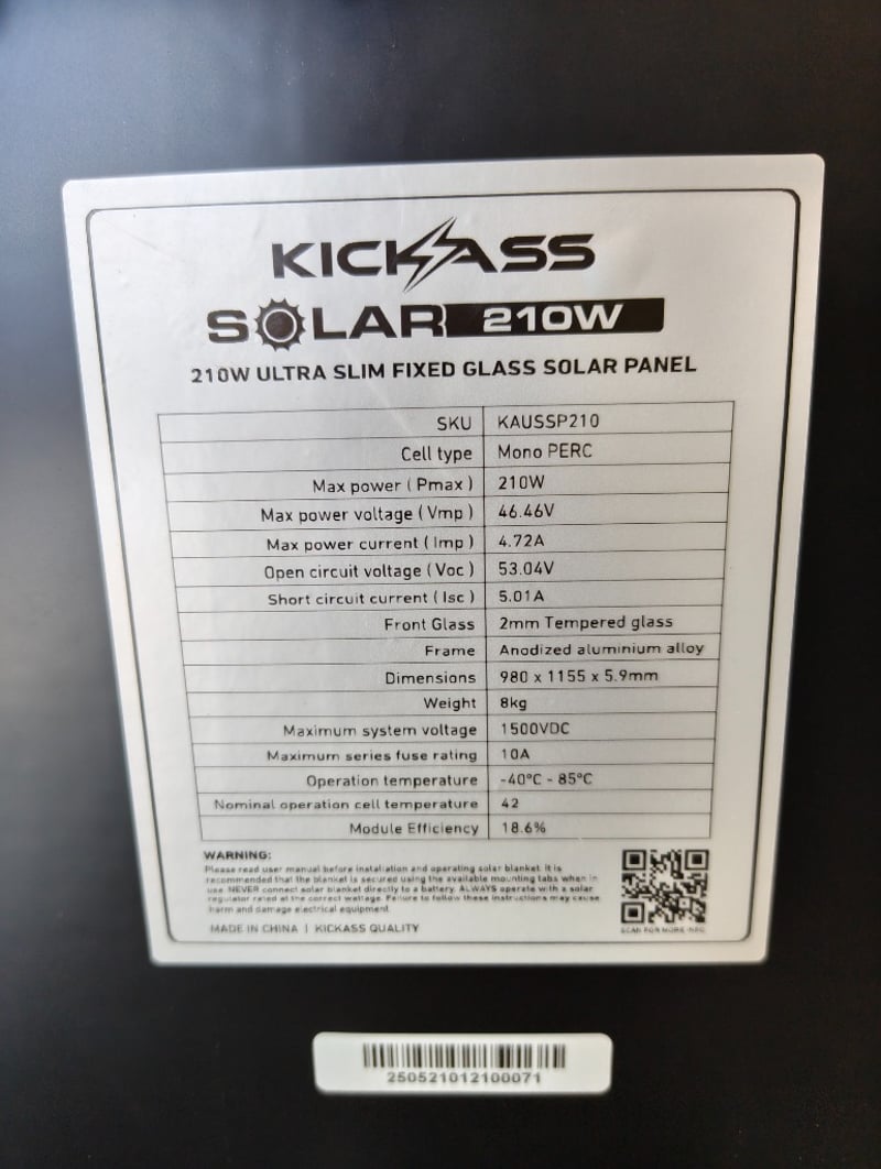 RRP $279.95 KickAss 210W Fixed Solar PanelDimensions: 116cm (H) x 98cm (W) x 1cm (D)Note: working condition unknown, minor marks and dents, inspection recommended