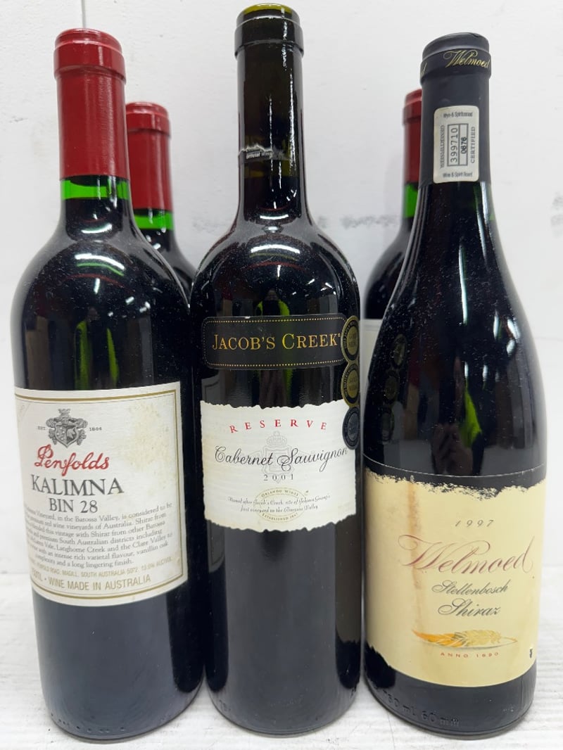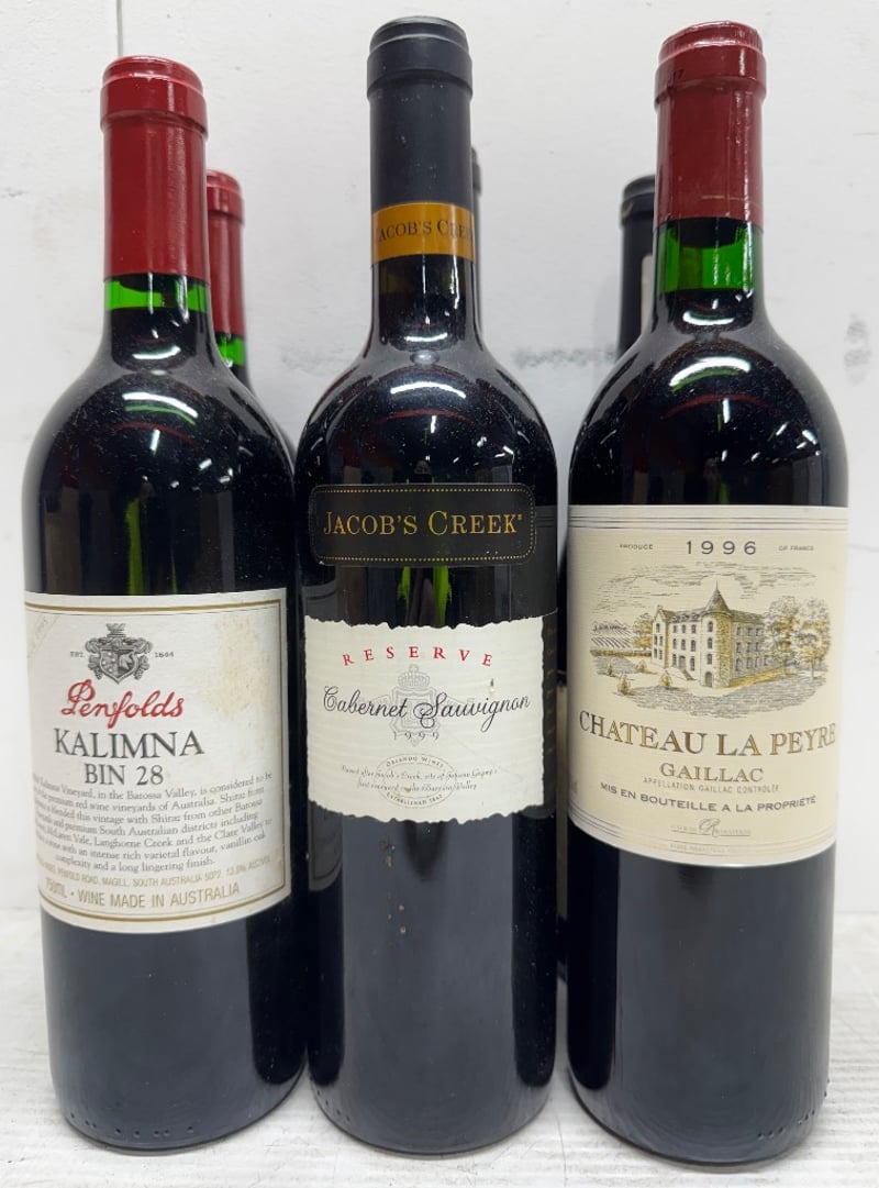 Wine. Mixed box. Including Penfolds Kalmina BIN 28, Jacobs Creek, 1999 Cabernet Sauvignon, 1996 Chateau La Peter, Gaillac and more. 6x750mL.