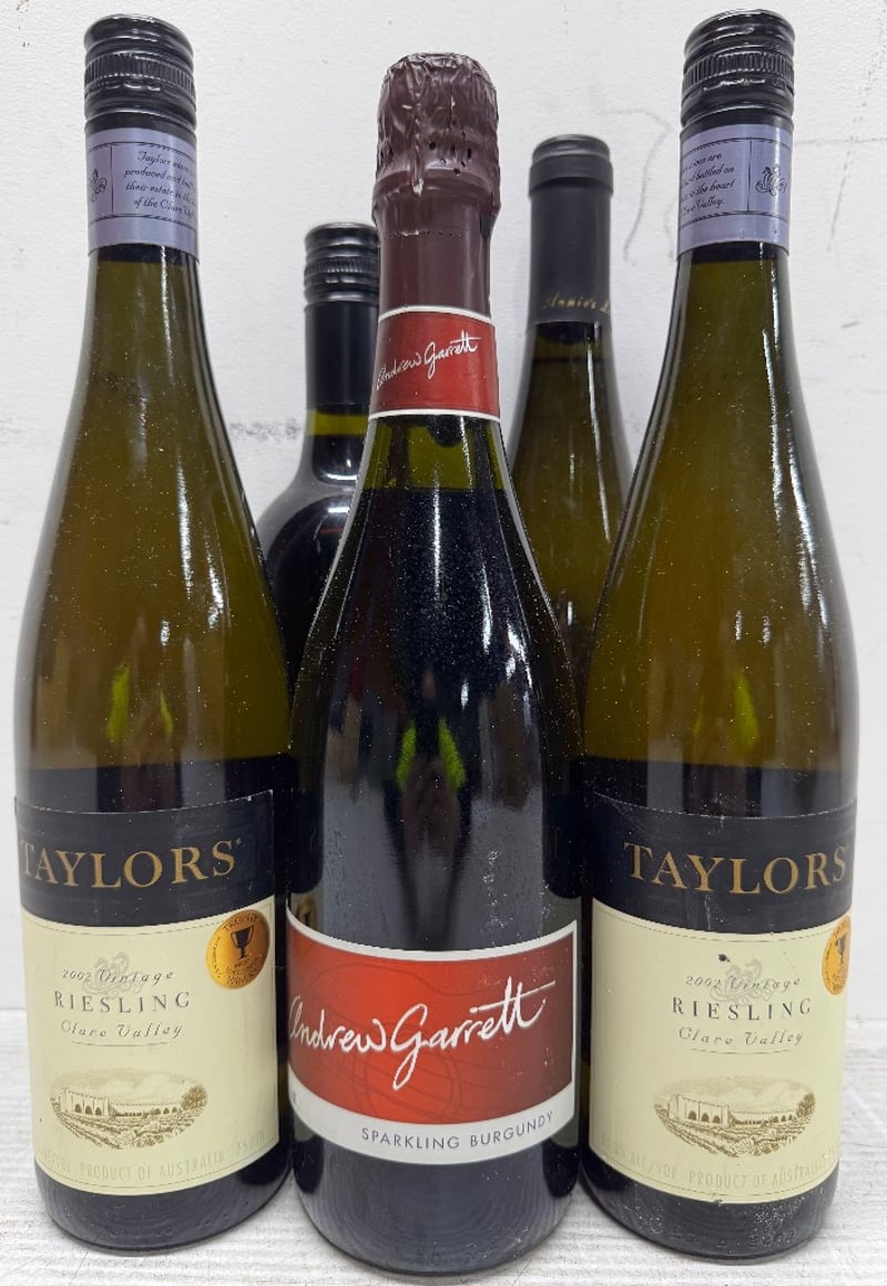 Wine. Mixed box. Including Taylor's 2002 Clare Valley Vintage Reisling, Andrew Garret - Sparkling Burgundy and more. 5x750mL.