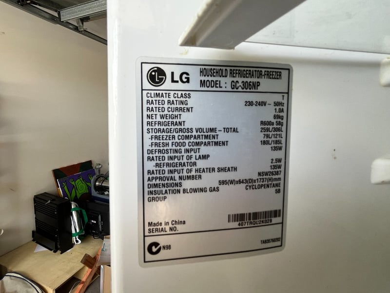 LG Fridge/FreezerMake: LGModel: GC-306NPSerial #: 407TRQU2K028Net Weight: 69kgLength: 643mmWidth: 595mmHeight: 1737mmSold as is,Location: Sarina, Mackay, 4737Contact: Bradley Taylor - 0473425094 - [email protected]