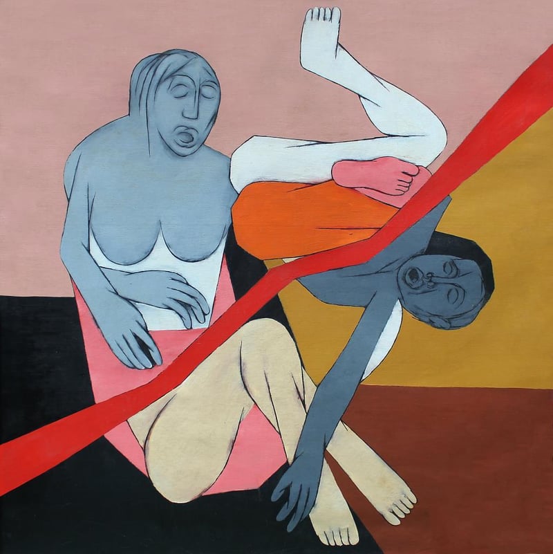 The distorted, fragmented figures reflect Mehta’s lifelong engagement with themes of violence, vulnerability, and existential struggle. Influenced by his personal experiences and post-war modernist thought, the artist reduced form to its bare essentials, flattened planes, stark outlines, and controlled colour fields. The diagonal acts as both a compositional anchor and a symbolic fracture, compelling the viewer to confront
