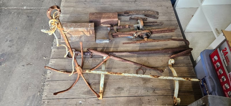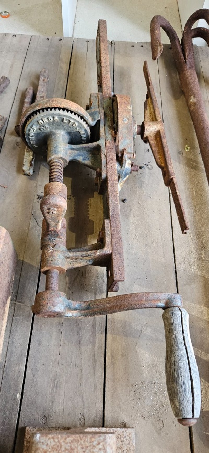Rustic Items, Assorted Items Including Industrial boat anchor, antique honey Extractor Part, and more