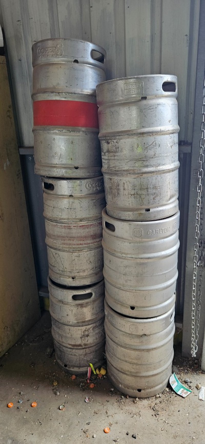 Kegs, 6x Steel Beer Kegs, includes Coopers, West End, and Carlton sold as lot