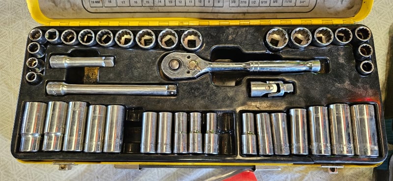 Tools, Including Stanley 42 piece socket set, 3/8" Drive, 1/4 Drive Socket set, and Impact Bit Kit