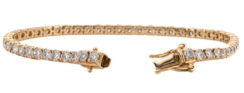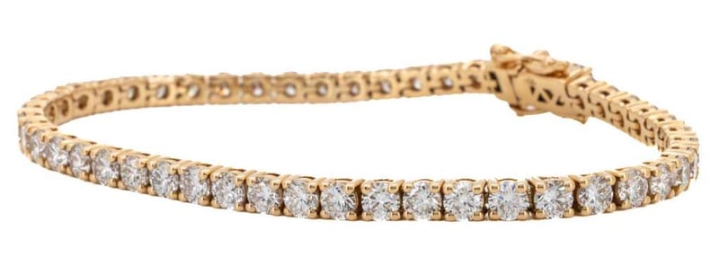 6.04 Carats 18K Yellow Gold Diamond Tennis Bracelet With A Box Clasp And 2 Safety Latches. The Bracelet Is In A Brand New Condition With A Polish Finish Featuring: