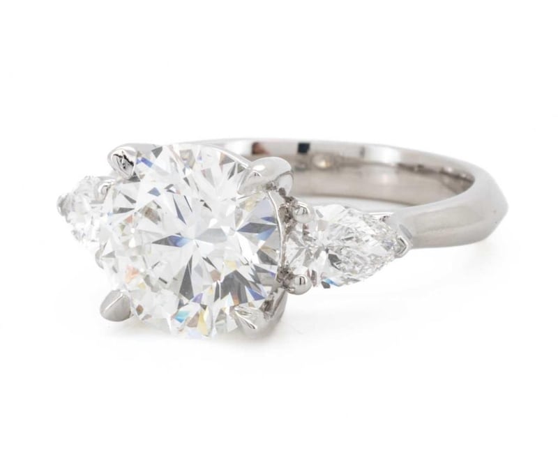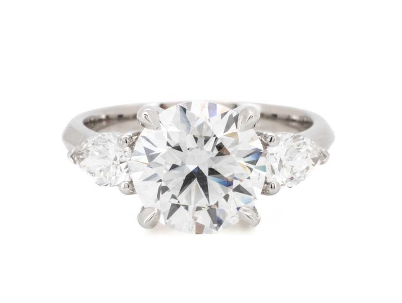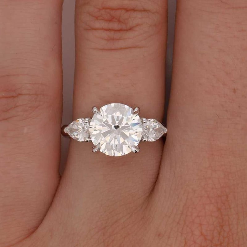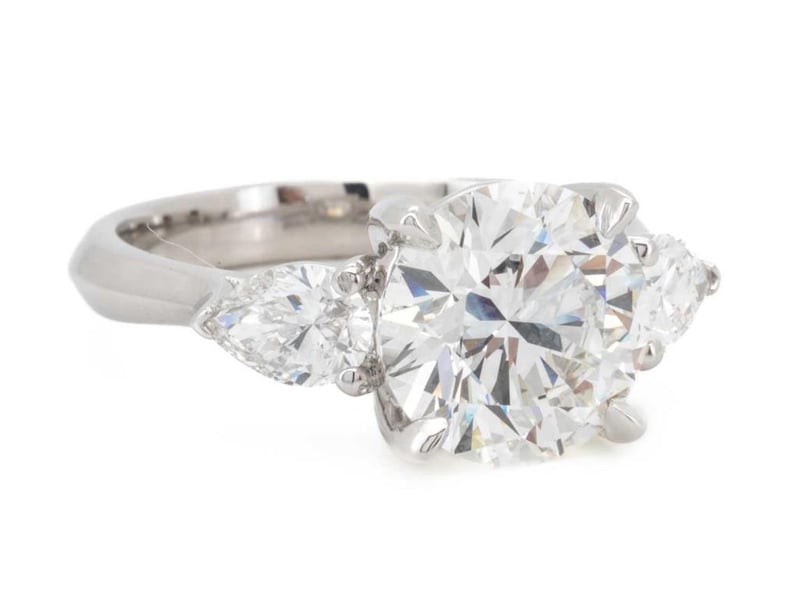 3.22 Carats Platinum Diamond Engagement Ring Igi Certified Centre Diamond = 2.71 Carat Round Brilliant Cut Diamond E/Vs2 Igi Certificate # Lg 631430789 Laser Inscribed : Labgrown Igi Lg 631430789 Cut : Ideal Polish : Excellent Symmetry : Excellent Flourescence : Non Type : Cvd Shoulder Diamonds 2 Pear Diamonds = 0.11 Carats Ring Finger Size N Ring Weight 5.60 Grams