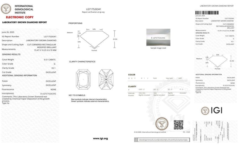 9.51 Radiant Cut Diamond G/Vs1 Igi Certificate # Lg 717526341 Laser Inscribed : Labgrown Igi Lg 717526341 Cut : Excellent Polish : Excellent Symmetry : Excellent Flourescence : None Type : Cvd