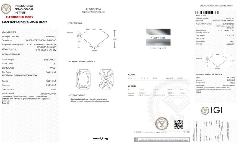5.08 Radiant Cut Diamond G/Vvs2 Igi Certificate # Lg 689521957 Laser Inscribed : Labgrown Igi Lg 689521957 Cut : Excellent Polish : Excellent Symmetry : Excellent Flourescence : None Type : Cvd