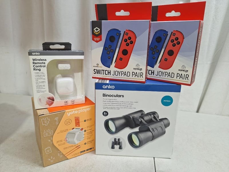 2 x POWERWAVE Switch Joypad pair, blue & red, RRP$69.00 each, NEW factory sealed in boxes, 1 x YOTO Player 3rd generation, "The audio player that kids control" 3-12+, NEW factory sealed in box, 1 x ANKO binoculars, 7 x 50 magnification, 8 +, NEW factory sealed in box, 1 x Anko wireless remote control ring, NEW factory sealed in box