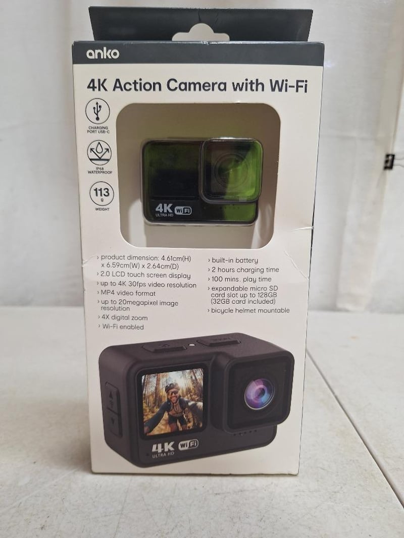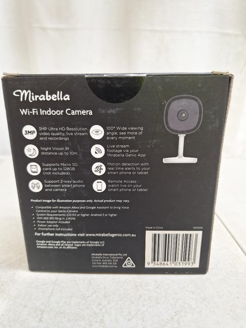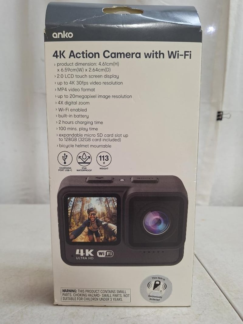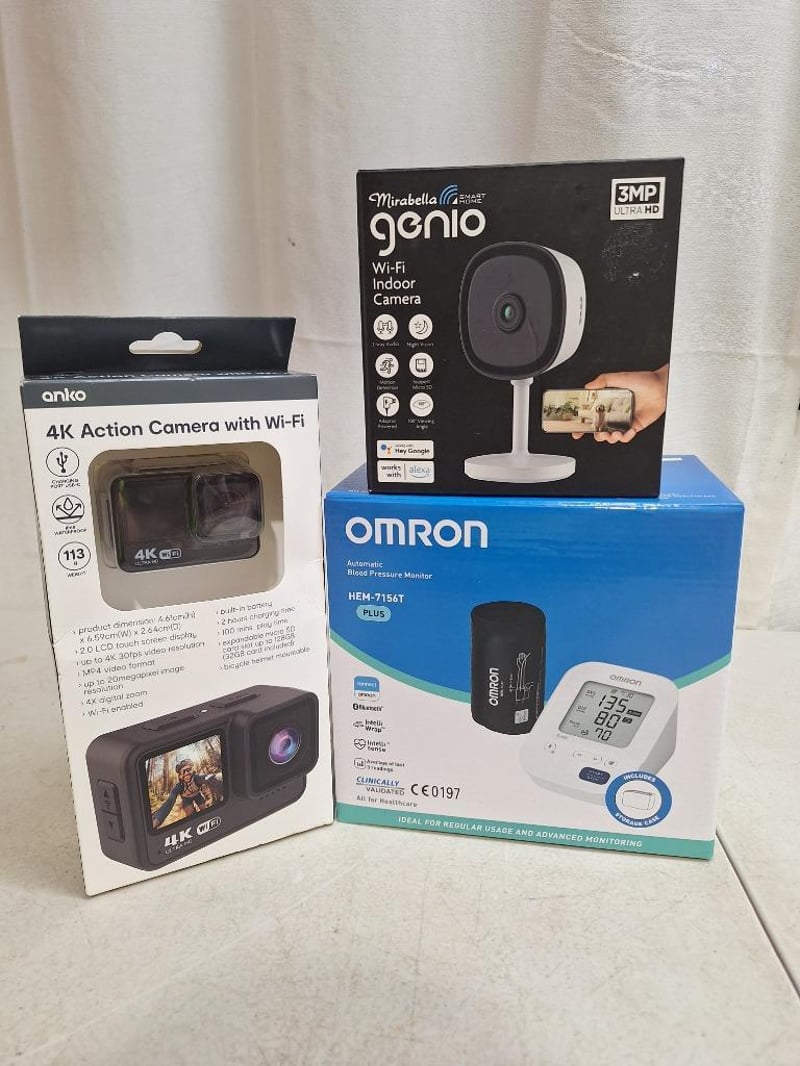 1 x OMRON automatic blood pressure monitor, HEM-7156T Plus, RRP$174.99, NEW factory sealed in box, 1 x ANKO 4K action camera with Wi-Fi, NEW factory sealed in box, 1 x MIRABELLA Genio Wi-Fi indoor camera, 3MP ultra HD, NEW factory sealed in box