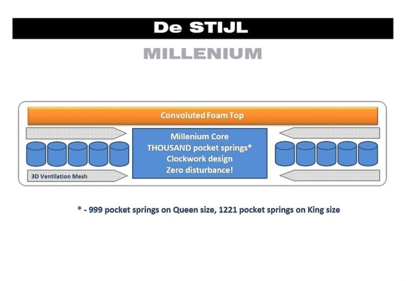 Millenium Queen - Thousand Springs MattressRecommended Retail Price: $4,681The Millenium features a Thousand Springs Core - the latest technology that brings comfort to a completely different level. A Thousand independent pocket springs*, each with individual response system, adjust in a silent clockwork design to any body weight, movement or posture. Combined with a bouncy ventilated Convoluted Foam top, the Millenium provides a smooth non-sinking support with personalised precision, resulting in feelings of lightness and youth, along with complete elimination of partner disturbance.For enhanced bedroom hygiene, the Millenium is fully surrounded by two 3D Mesh constant ventilation channels, to remove any natural odours, and to minimise absorption of heat and humidity in warm climates.The Millenium mattress features:A Thousand Springs Core*, reacting in clockwork design to any scenarioBouncy ventilated Convoluted Foam topSmooth non-sinking support precisely adjusting to any weight and any sleep positionTwo constant ventilation channels to remove natural odours, humidity and heatImpeccable quilting and finish Firmness of mattress: Medium FirmDouble sealed and vacuum packed immediately after production for hygiene during storage and convenient transportationStandard Australian Queen size, suits any type of existing standard Queen size bed base* - 999 Pocket Springs on Queen size, 1221 Pocket Springs on King size