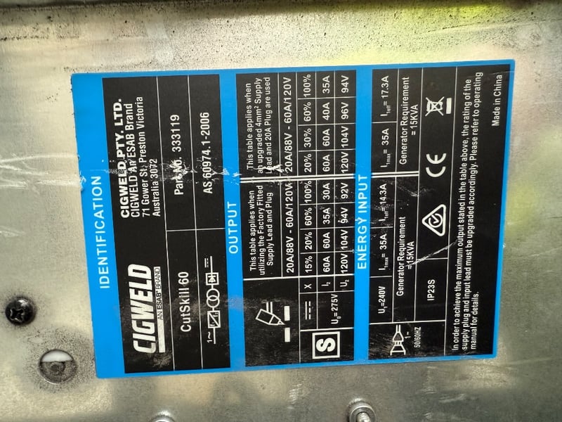 Welding Machine, Cigweld Cutskill 60 Plasma Cutter, Includes trolly/ accessoriesQuantity-1