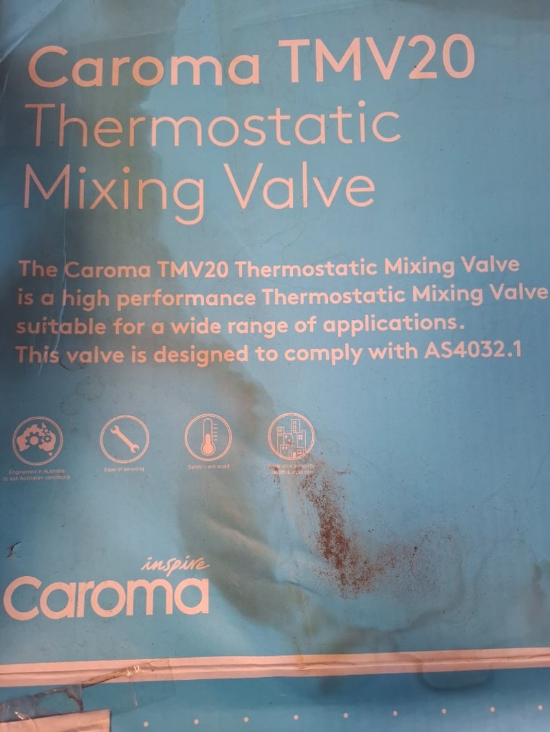 1 x Caroma TMV20 Themostatic Mixing Valve. Note: Boxes are damaged and Stained Inspection Recommended