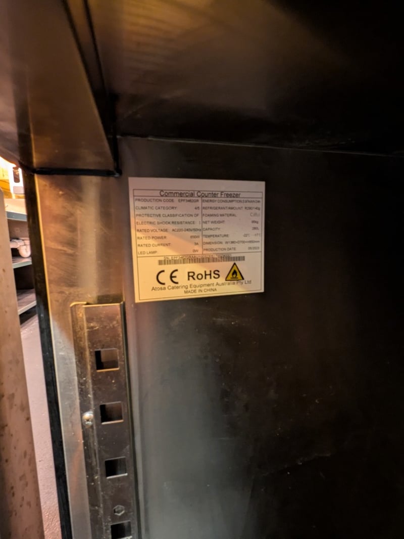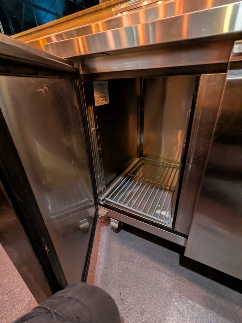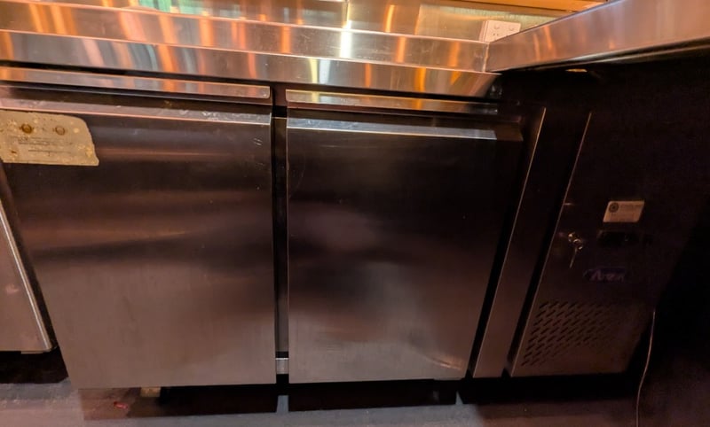 Stainless steel two-door bench fridge.Serial number: EPF3462GRAAU100323051700790001Dims: H:85 cm, W:70 cm, L:130 cmNOTE: Signs of wear and tear, refer to the photos, item untested.