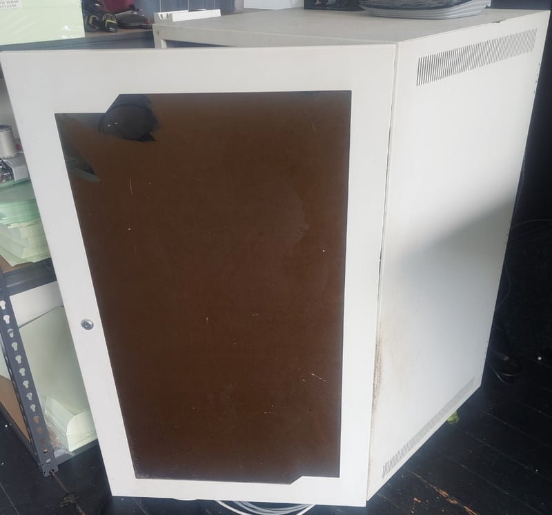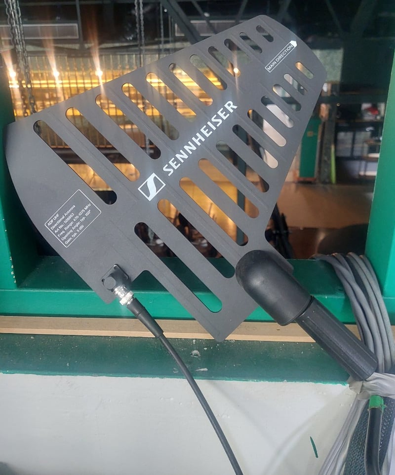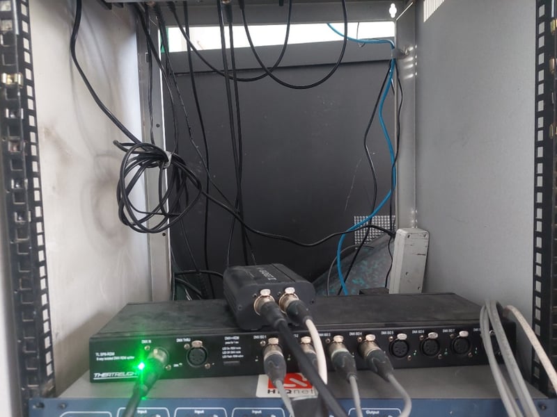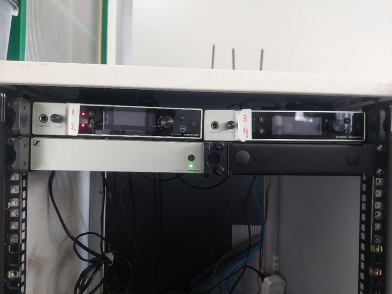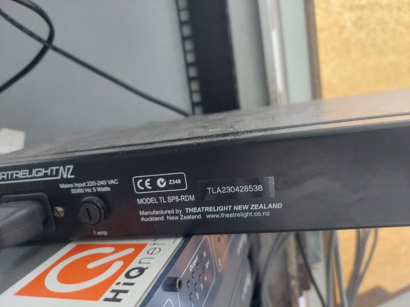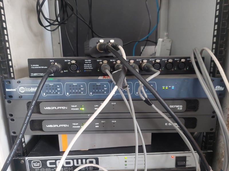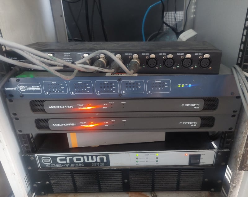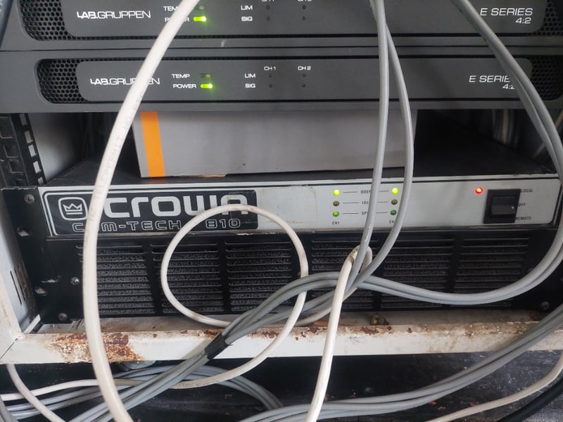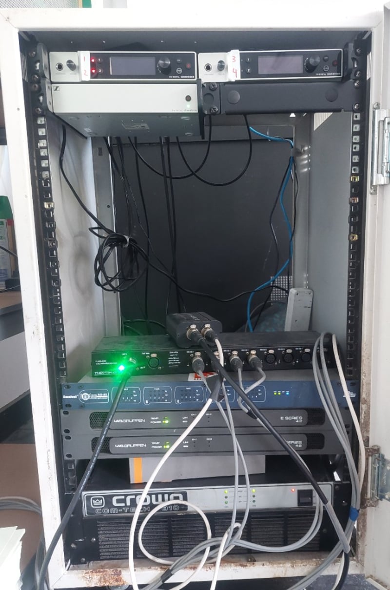 Apple MacBook Air laptop and Audio-visual (AV) equipment rack (NOTE LAPTOP HAS SOFTWARE TO OPERATE THE RACK) containing various components including: Laptop: Screen Dims: 32cm L, 22cm H, 1cm W Note: item is untested, signs of wear charger included. Sennheiser EW-DX series digital wireless receiver rackmount unit. ETC Gadget II, a portable USB-to-DMX interface. Model: 4267A1104 Serial number: 493433092 Theatrelight TL SPB-RDM 8-way isolated DMX RDM splitter. Model: TLSP8-RDM Serial number: TLA230428538 Soundweb London BLU-100 networked signal processor. Lab.Gruppen E 4:2 power amplifier. Crown Com-Tech 810 professional power amplifier. Cabinet Dims: 54cm L, 50cm W, 93cm H TP-Link router Model:Archer C20 Serial number : 22381J8003642 Power Dynamics PDX40 Stereo BT Audio Receiver. Model: 172.770 Serial number:172770/090123/0151 Sennheiser ADP UHF Passive Directional Antenna. Sold as a lot. Note: items are untested, signs of wear.