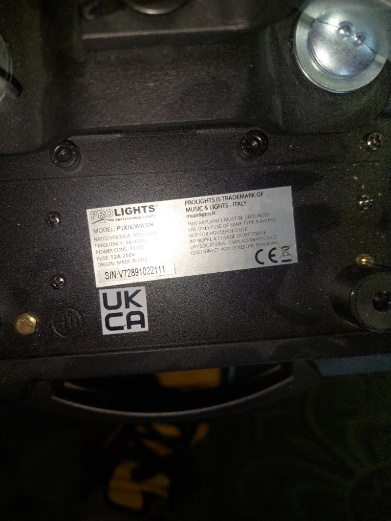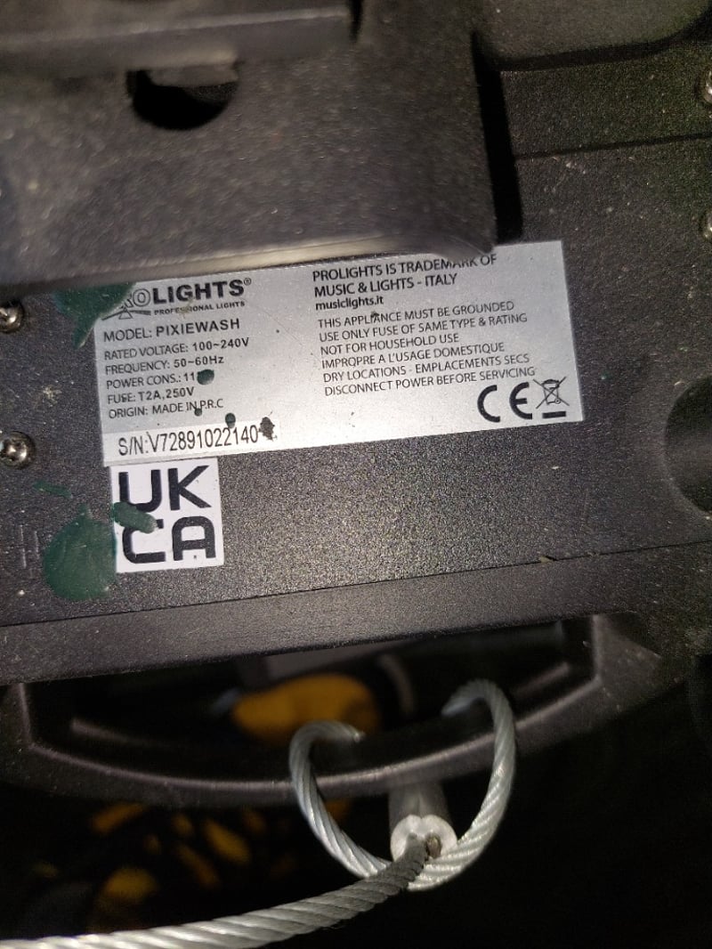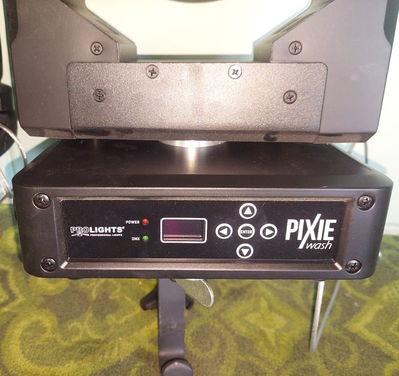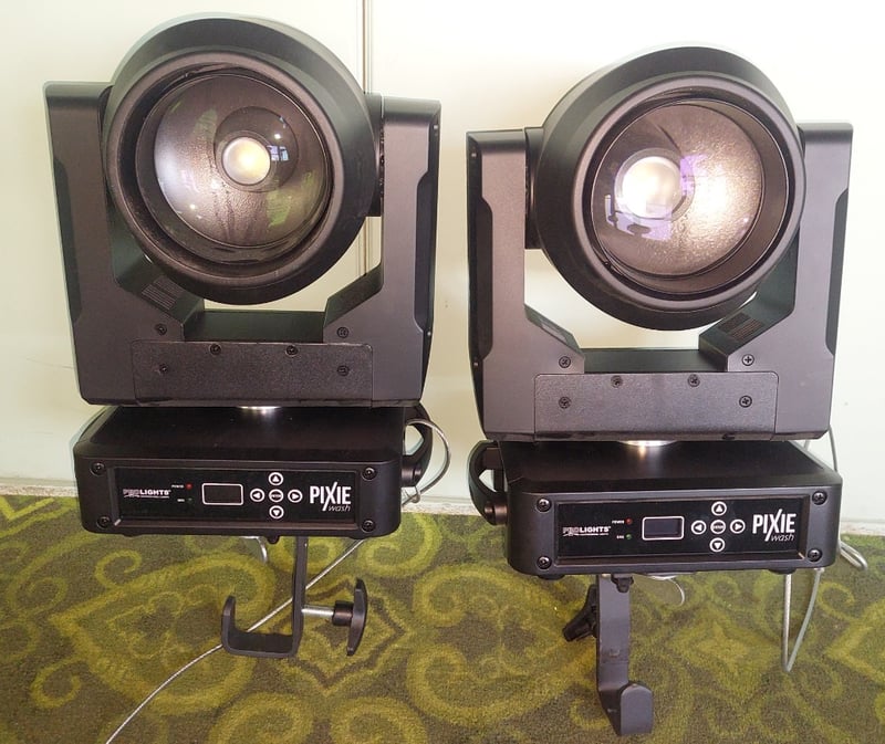 Prolights Pixie Wash, a professional moving head stage lighting fixture. Qty: 2 per lot.Serial number: V72891022111, V7297810140Sold as a lot.Note: items are untested, signs of wear.