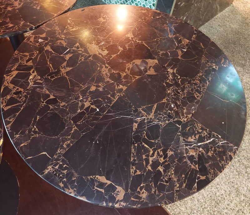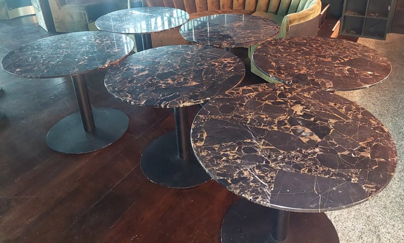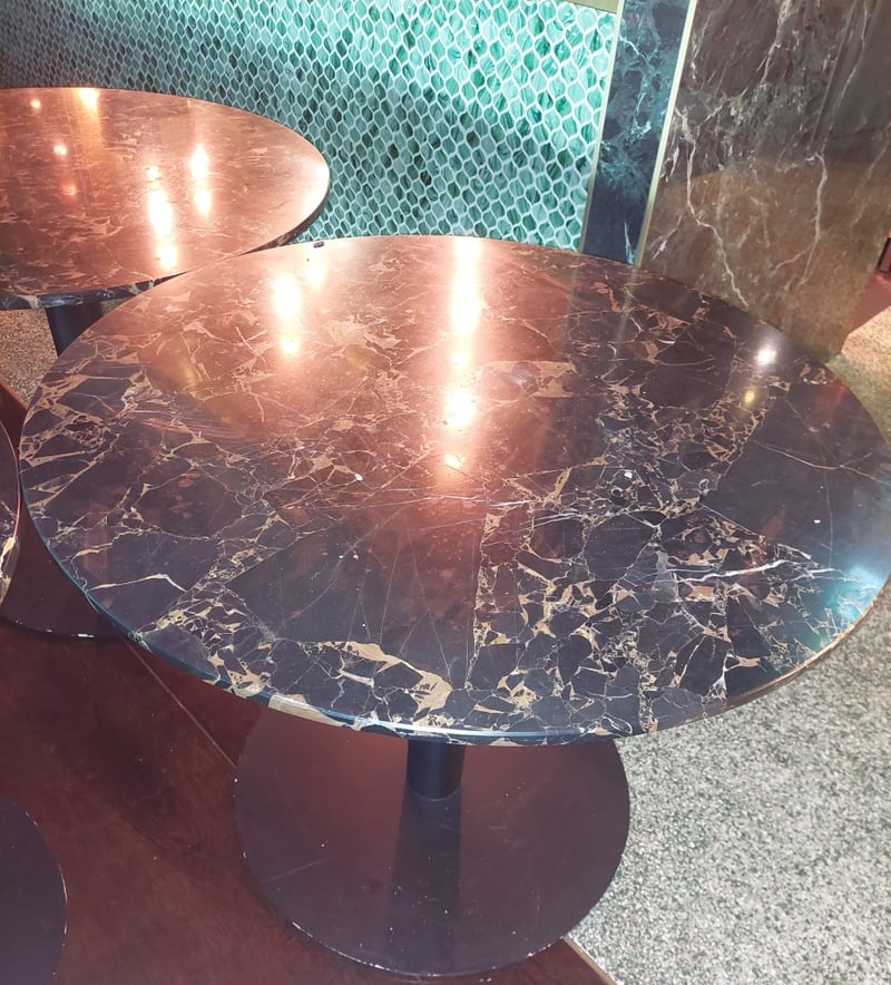 x6 Round dining tables. Dims per table: 80cm H, 90cm L, 90cm W Sold as a lot. Note: signs of wear.