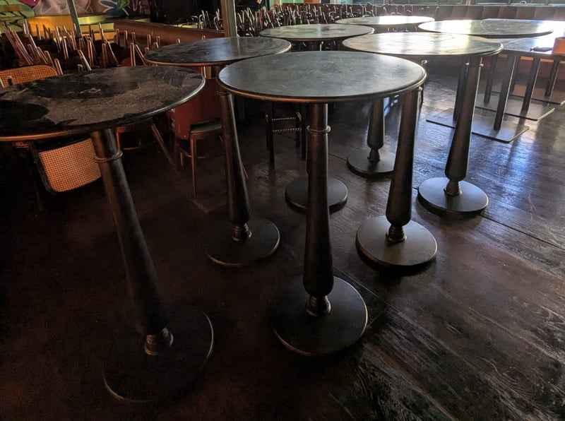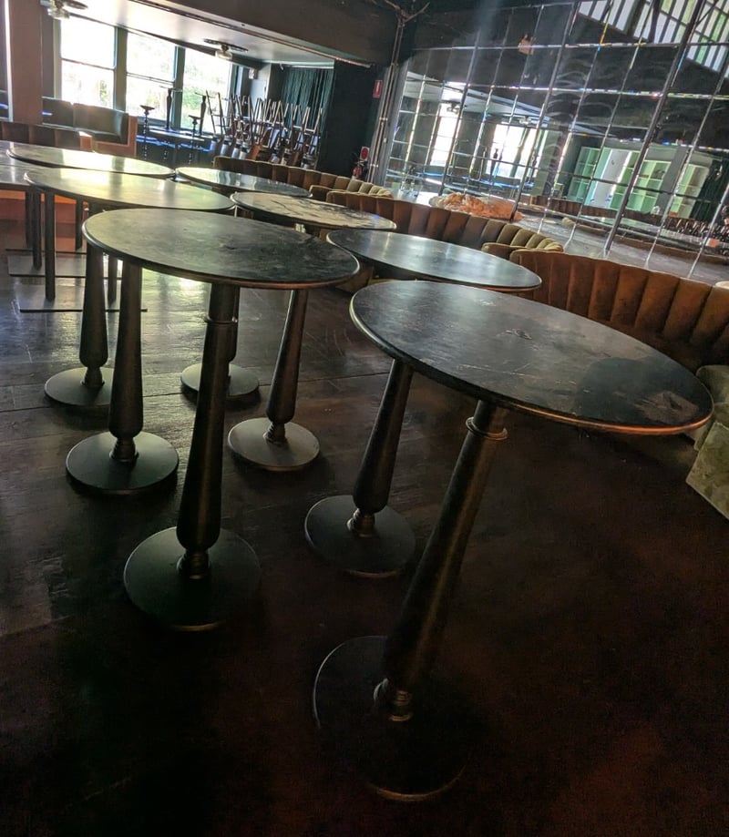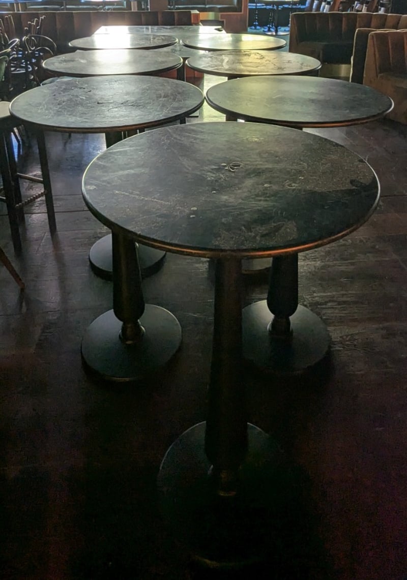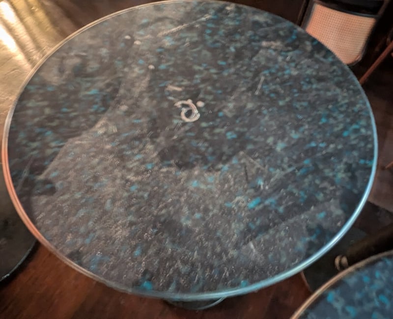 Green and black round coffee table with black base. Table 1 dims: H:110 cm, L:65 cm, W:65 cm NOTE: Signs of wear and tear. Sold as a lot