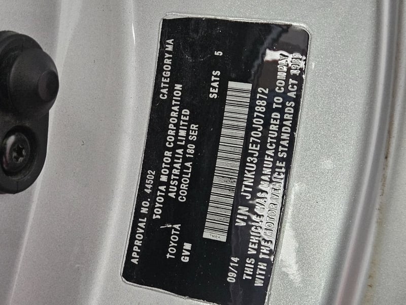 **Ex-Government** 2014 Toyota Corolla ZRE182R Ascent Sport Price Guide - $9,950 to $12,500 (Based on standard condition unmodified, excluding attachments and/or additions) Year: 2014 Make: Toyota Model: Corolla Series: ZRE182R Badge: Ascent Sport Body: 5-Door Hatch Drive Type: Front wheel drive Odometer: Indicating 57,939 Kilometers Engine: 1.8 I4 Petrol Transmission: Continuously variable Colour: Silvee Seats: 5 Description/extras: Air Conditioning, Power windows, Reverse camera, Central locking. VIN: JTNKU3JE70J078872 ENG No: 2ZR1431883 (as per PPSR) (Key #SS49) Lloyds stock #990918+1