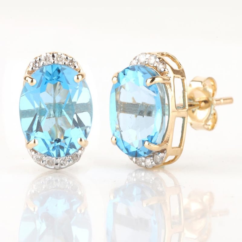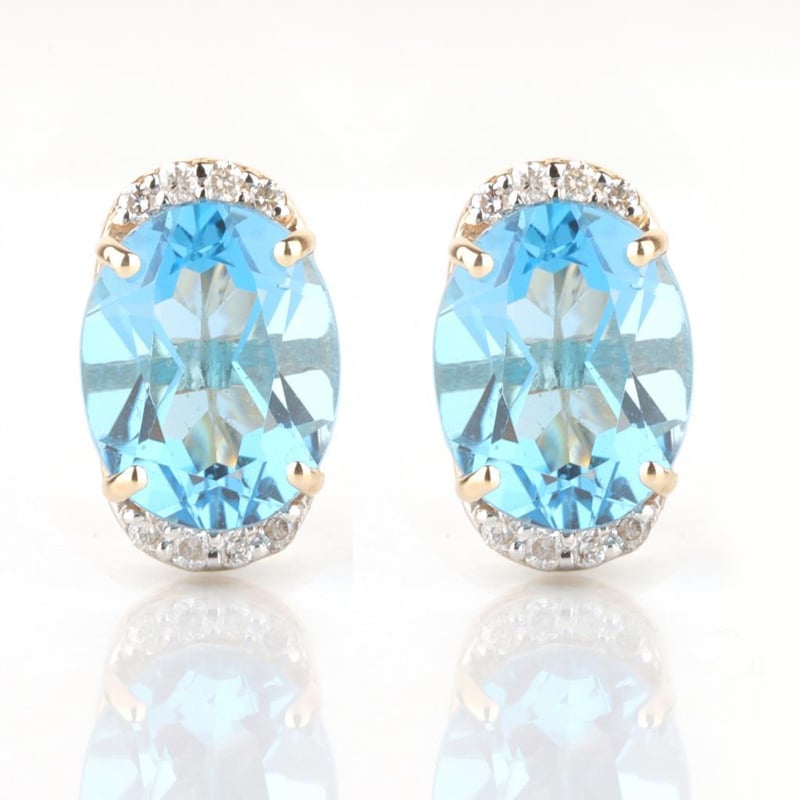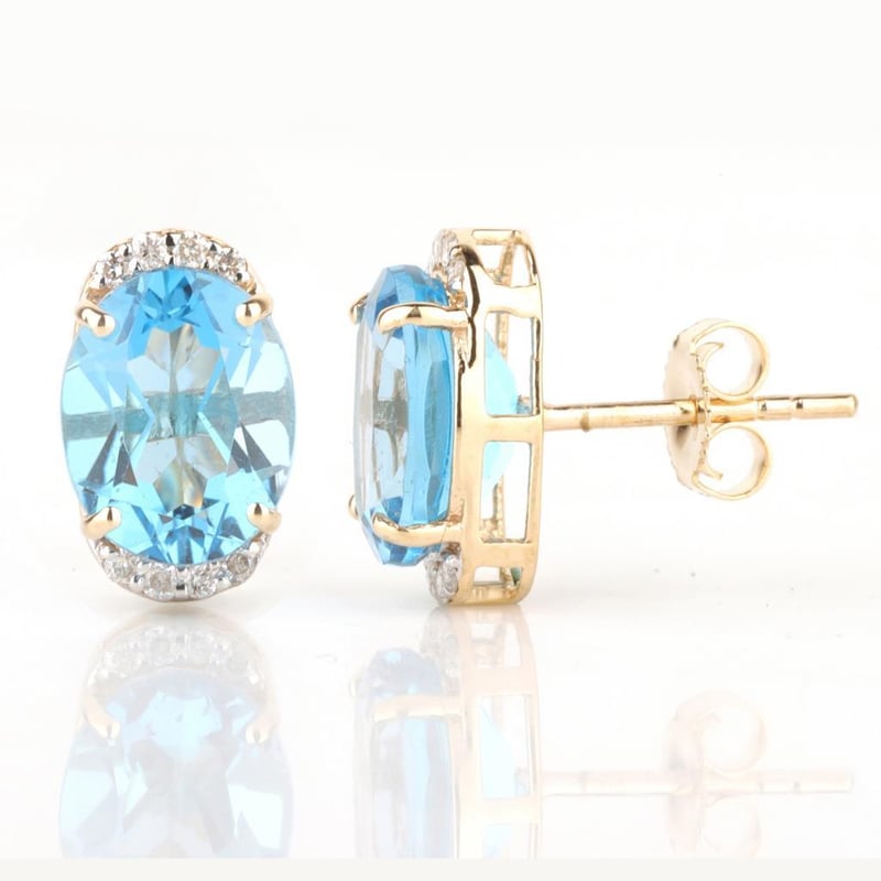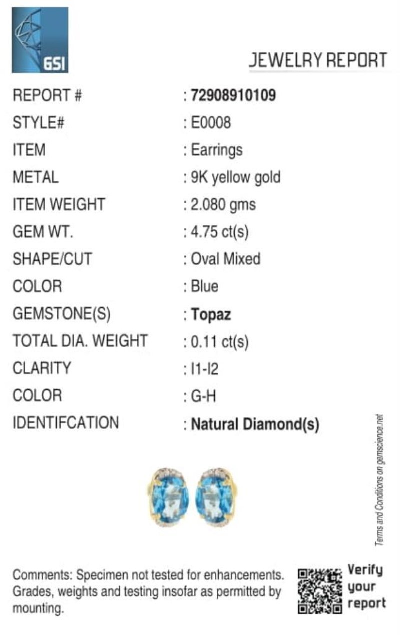 9CT YELLOW GOLD NATURAL SWISS BLUE TOPAZ & DIAMOND EARRINGS Weight Of The Item: 2.08 GFineness Of Metal(S): Yellow Gold 9KtThe Earrings Consists Of (2) Oval Brilliant Natural Swiss Blue Topaz. Surrounding The Main Stones Are Round Brilliant Cut Natural Diamonds.Identification: Natural Swiss Blue TopazColor: BlueShape: Oval Brilliant CutNo. Of Stone: 2Dimension: 9 Mm X 7 Mm X 5.4 MmWeight: 4.75 CaratsCut: Very GoodIdentification: Natural DiamondShape: Round Brilliant CutWeight: 0.11 CtsCertificates Are Provided By Gemological Science International (Gsi), An Independent Third-Party Gemological Laboratory Based In The Usa And Recognised Among The Top 10 Gem Labs Globally Condition: Good - Refer Images 0160841+50