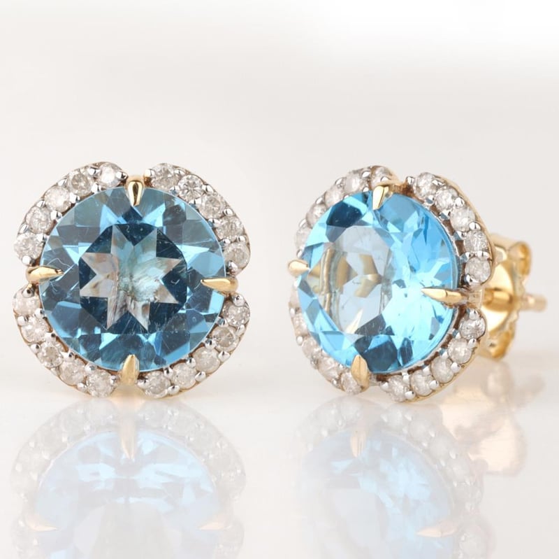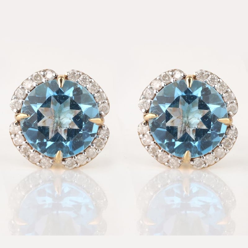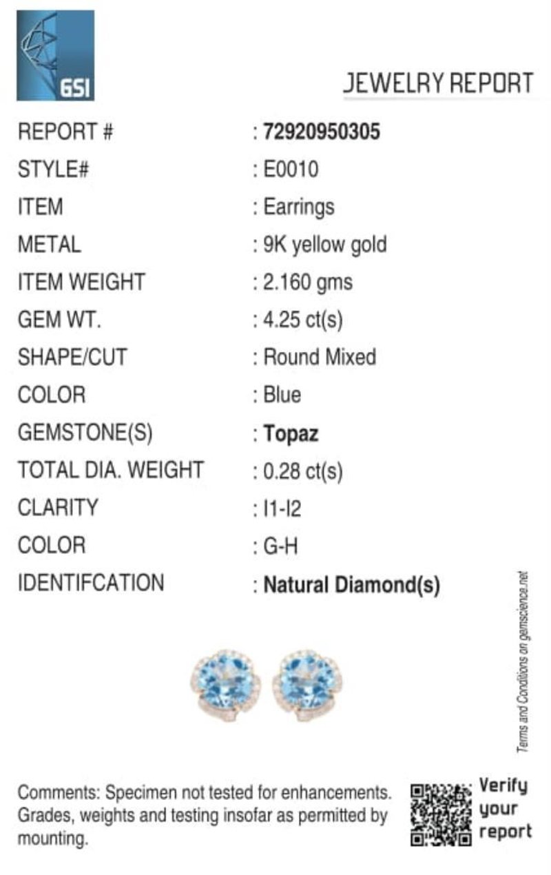 9CT YELLOW GOLD NATURAL SWISS BLUE TOPAZ & DIAMOND EARRINGS Weight Of The Item: 2.16 GFineness Of Metal(S): Yellow Gold 9KtThe Earrings Consists Of (2) Round Brilliant Natural Swiss Blue Topaz. Surrounding The Main Stones Are Round Brilliant Cut Natural Diamonds.Identification: Natural Swiss Blue TopazColor: BlueShape: Round Brilliant CutNo. Of Stone: 2Dimension: 8 Mm X 8 Mm X 4.8 MmWeight: 4.25 CaratsCut: Very GoodIdentification: Natural DiamondShape: Round Brilliant CutWeight: 0.28 CtsCertificates Are Provided By Gemological Science International (Gsi), An Independent Third-Party Gemological Laboratory Based In The Usa And Recognised Among The Top 10 Gem Labs Globally Condition: Good - Refer Images 0160841+63