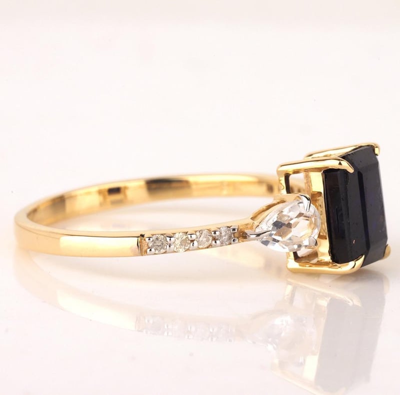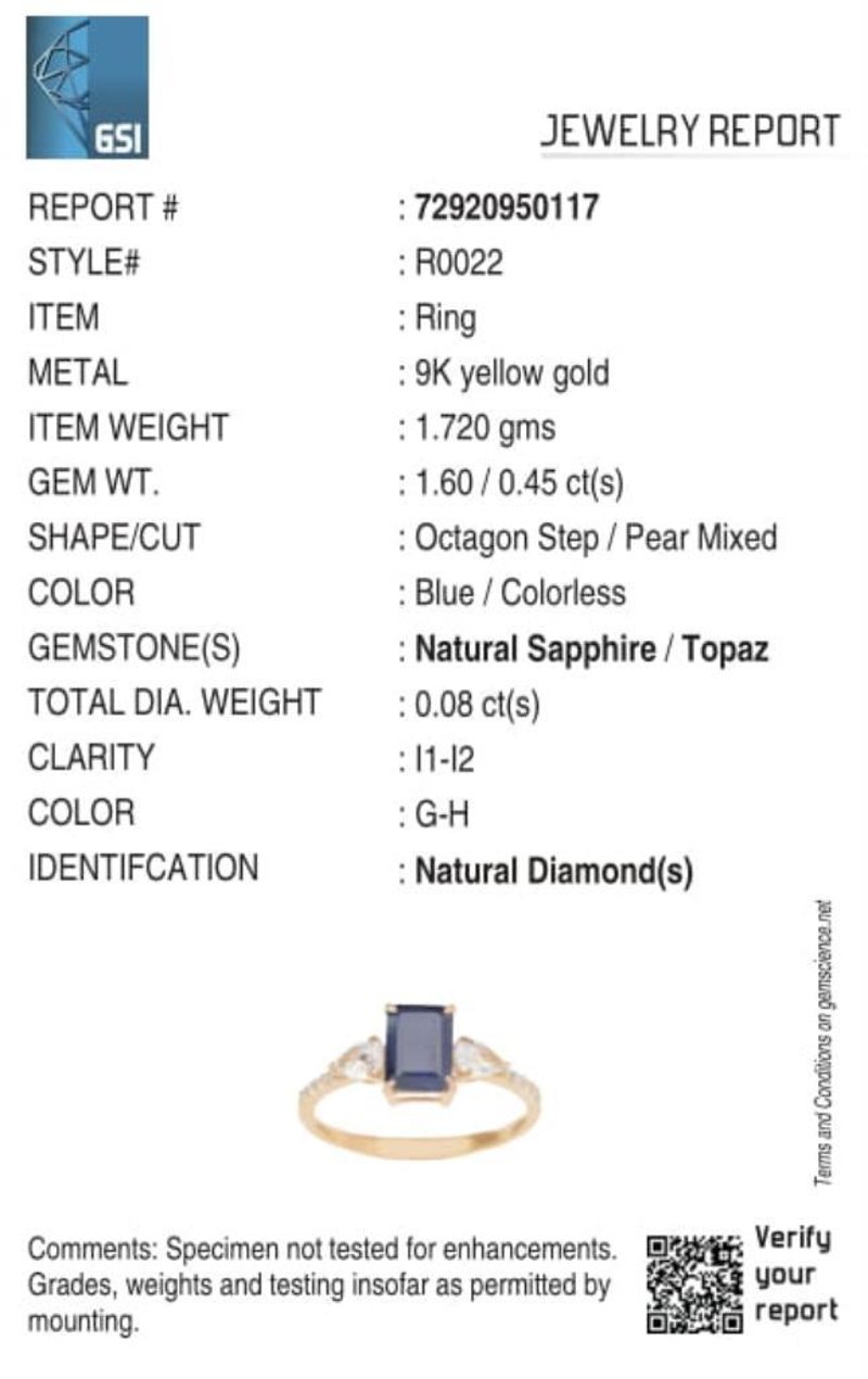 9CT YELLOW GOLD NATURAL BLUE SAPPHIRE & DIAMOND RING Weight Of The Item: 1.72 GFineness Of Metal(S): Yellow Gold 9KtThe Ring Consists Of (1) Octagon Brilliant Natural Blue Sapphire & (2) Round Brilliant Cut White Topaz. Surrounding The Main Stones Are Round Brilliant Cut Natural Diamonds.Ring Size: Us 7Identification: Natural Blue Sapphire / Natural White TopazColor: Blue / WhiteShape: Octagon Brilliant Cut / Pear Faceted CutNo. Of Stone: 3Dimension: 7 Mm X 5 Mm X 4.2 MmWeight: 1.6 Carats / 0.45 CaratsCut: Very GoodIdentification: Natural DiamondShape: Round Brilliant CutWeight: 0.08 CtsCertificates Are Provided By Gemological Science International (Gsi), An Independent Third-Party Gemological Laboratory Based In The Usa And Recognised Among The Top 10 Gem Labs Globally Condition: Good - Refer Images 0160841+107