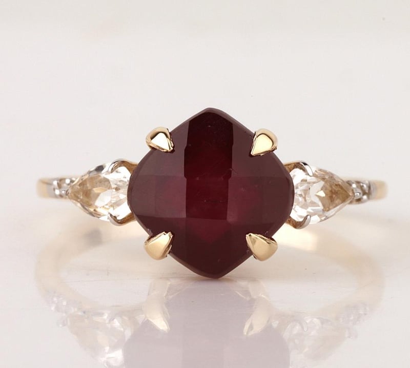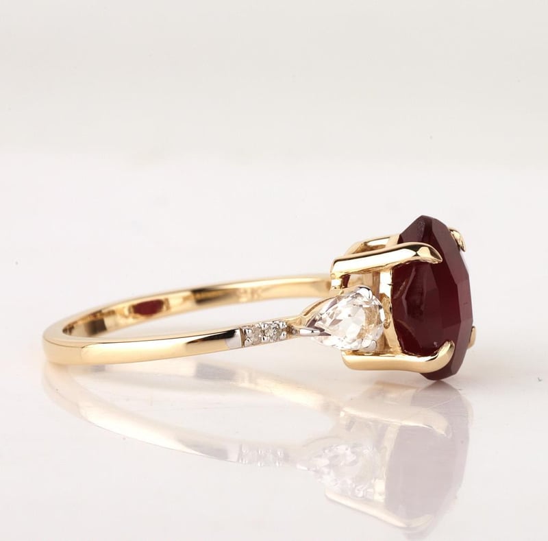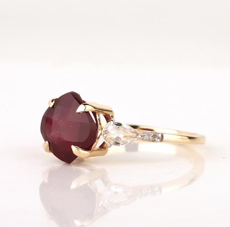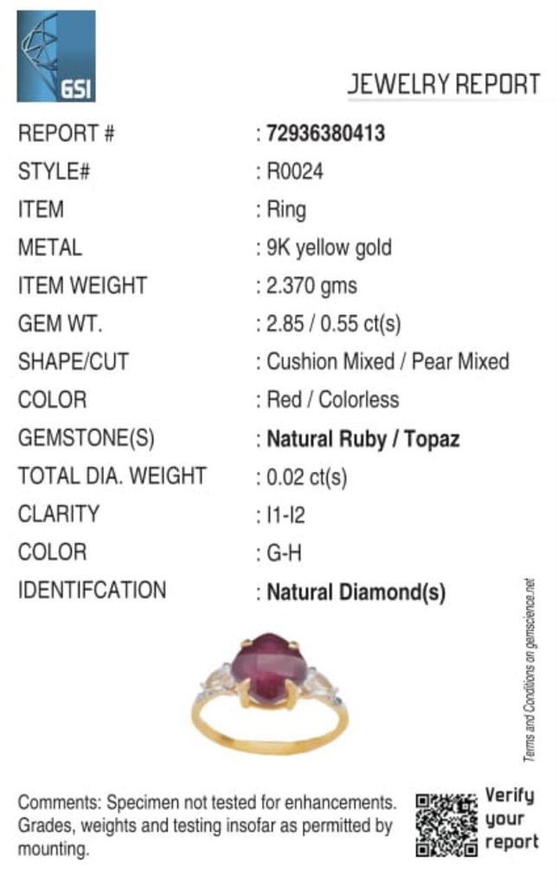 9CT YELLOW GOLD NATURAL RUBY & DIAMOND RING Weight Of The Item: 2.37 GFineness Of Metal(S): Yellow Gold 9KtThe Ring Consists Of (1) Round Brilliant Natural Ruby & (2) Round Brilliant Cut White Topaz. Surrounding The Main Stones Are Round Brilliant Cut Natural Diamonds.Ring Size: Us 7Identification: Natural Ruby / Natural White TopazColor: Red / WhiteShape: Round Brilliant Cut / Pear Faceted CutNo. Of Stone: 3Dimension: 8 Mm X 8 Mm X 4.8 MmWeight: 2.85 Carats / 0.55 CaratsCut: Very GoodIdentification: Natural DiamondShape: Round Brilliant CutWeight: 0.02 CtsCertificates Are Provided By Gemological Science International (Gsi), An Independent Third-Party Gemological Laboratory Based In The Usa And Recognised Among The Top 10 Gem Labs Globally Condition: Good - Refer Images 0160841+118