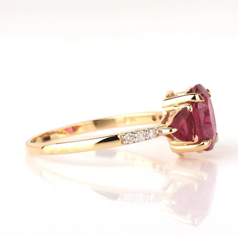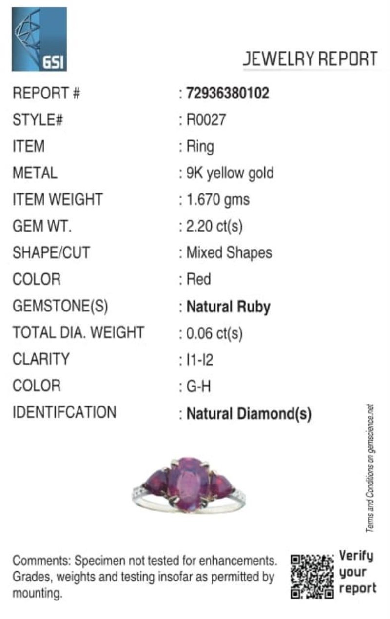 9CT YELLOW GOLD NATURAL RUBY & DIAMOND RING Weight Of The Item: 1.67 GFineness Of Metal(S): Yellow Gold 9KtThe Ring Consists Of (1) Oval Brilliant Natural Ruby & (2) Round Brilliant Cut Ruby. Surrounding The Main Stones Are Round Brilliant Cut Natural Diamonds.Ring Size: Us 7Identification: Natural Ruby / Natural RubyColor: Red / RedShape: Oval Brilliant Cut / Trillion Faceted CutNo. Of Stone: 3Dimension: 8 Mm X 6 Mm X 4.8 MmWeight: 1.6 Carats / 0.6 CaratsCut: Very GoodIdentification: Natural DiamondShape: Round Brilliant CutWeight: 0.06 CtsCertificates Are Provided By Gemological Science International (Gsi), An Independent Third-Party Gemological Laboratory Based In The Usa And Recognised Among The Top 10 Gem Labs Globally Condition: Good - Refer Images 0160841+142