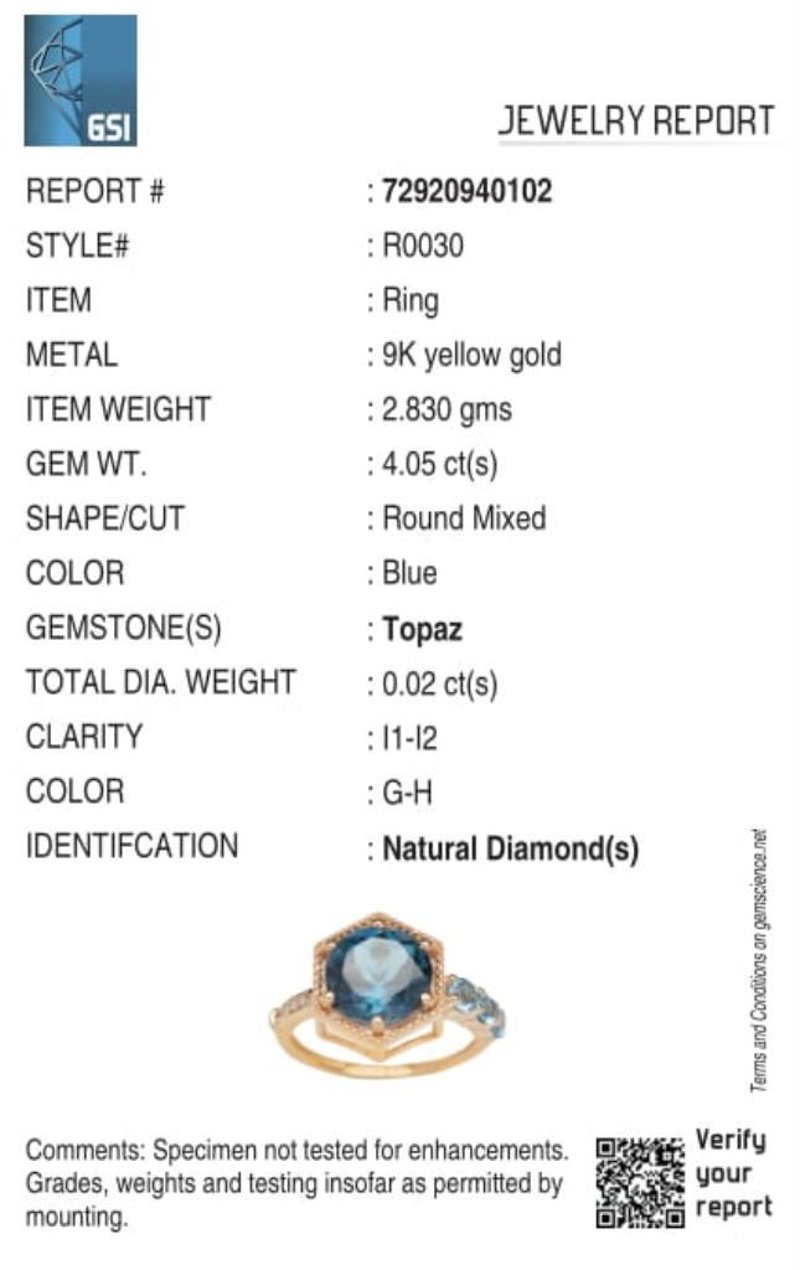 9CT YELLOW GOLD NATURAL LONDON BLUE TOPAZ & DIAMOND RING Weight Of The Item: 2.83 GFineness Of Metal(S): Yellow Gold 9KtThe Ring Consists Of (1) Round Brilliant Natural London Blue Topaz & (3) Round Brilliant Cut Swiss Blue Topaz. Surrounding The Main Stones Are Round Brilliant Cut Natural Diamonds.Ring Size: Us 6Identification: Natural London Blue Topaz / Natural Swiss Blue TopazColor: Blue / BlueShape: Round Brilliant Cut / Round Faceted CutNo. Of Stone: 4Dimension: 9 Mm X 9 Mm X 5.4 MmWeight: 3.65 Carats / 0.4 CaratsCut: Very GoodIdentification: Natural DiamondShape: Round Brilliant CutWeight: 0.02 CtsCertificates Are Provided By Gemological Science International (Gsi), An Independent Third-Party Gemological Laboratory Based In The Usa And Recognised Among The Top 10 Gem Labs Globally Condition: Good - Refer Images 0160841+155