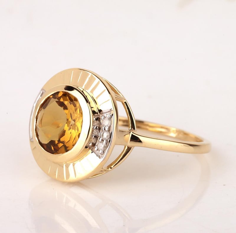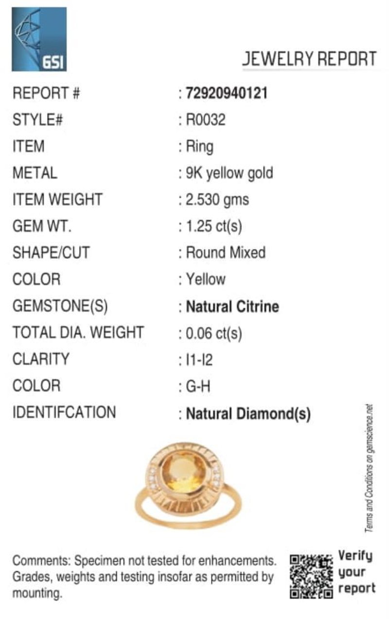 9CT YELLOW GOLD NATURAL CITRINE & DIAMOND RING Weight Of The Item: 2.53 GFineness Of Metal(S): Yellow Gold 9KtThe Ring Consists Of (1) Round Brilliant Natural Citrine. Surrounding The Main Stones Are Round Brilliant Cut Natural Diamonds.Ring Size: Us 7Identification: Natural CitrineColor: YellowShape: Round Brilliant CutNo. Of Stone: 1Dimension: 8 Mm X 8 Mm X 4.8 MmWeight: 1.25 CaratsCut: Very GoodIdentification: Natural DiamondShape: Round Brilliant CutWeight: 0.06 CtsCertificates Are Provided By Gemological Science International (Gsi), An Independent Third-Party Gemological Laboratory Based In The Usa And Recognised Among The Top 10 Gem Labs Globally Condition: Good - Refer Images 0160841+164