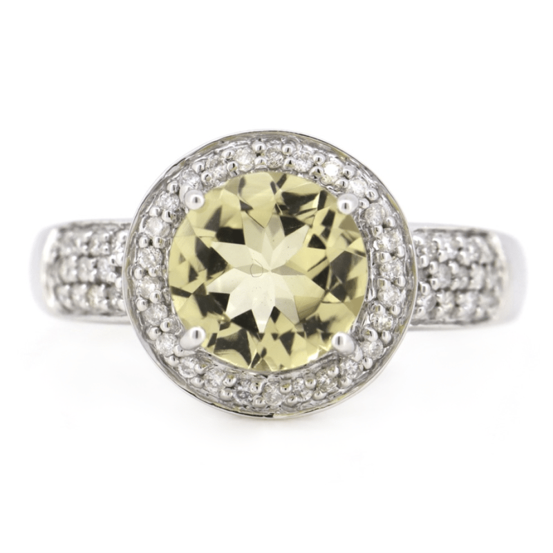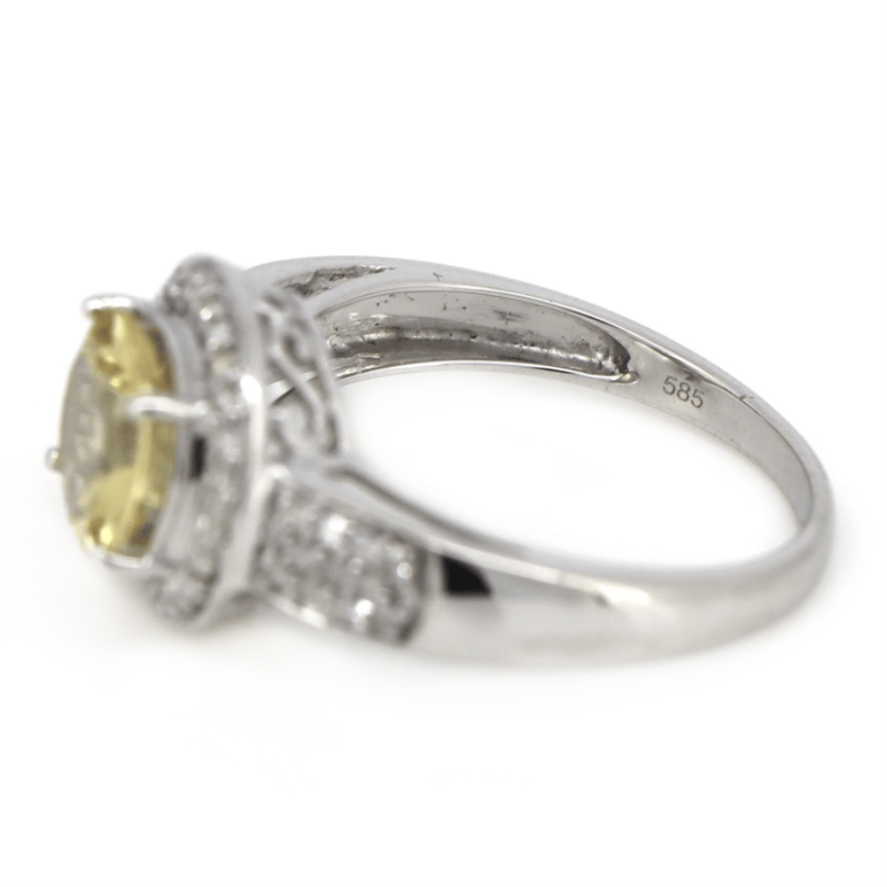 14K WHITE GOLD, HELIODOR AND DIAMOND, HALO RING. The Centre Features, One Fine Round Cut, Light Yellow, Heliodor (1.44Ct, Eye Clean Clarity), 4 Claw Set. Surrounding The Centre In A Halo And Decorating The Band Are, 48 Round Brilliant Cut, Diamonds (0.21Ct Tdw, J-K Colour, Si2-I2 Clarity), Bead Set. Ring Size N. Valuations Provided by an Independent Third-Party Professional Not Directly Associated With Lloyds Auctions at AUD $$6,490.00This valuation has been conducted by an independent third-party professional. The valuation amount is an assessment by the issuing valuer and does not reflect the auction value of the item. Any inquiries regarding the valuation should be directed to the issuing valuer (refer to contact details on the certificate), as Lloyds Auctions has no affiliation or influence over the valuation, the valuer, or the stated amount. Condition: Good - Refer Images 0645909+1614