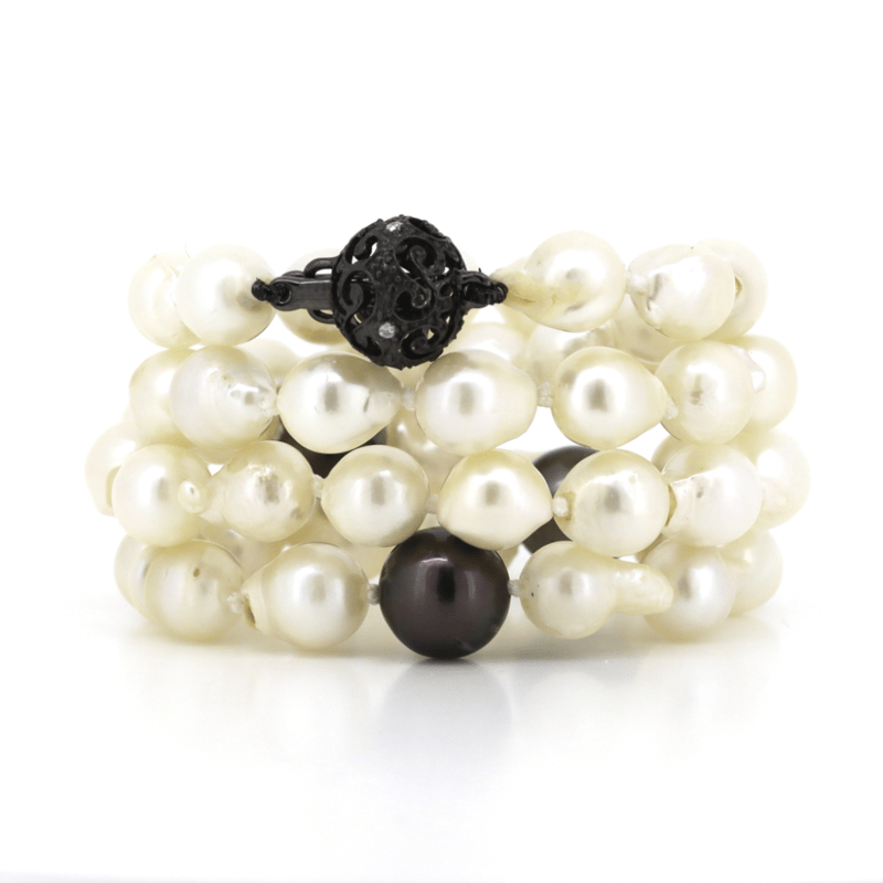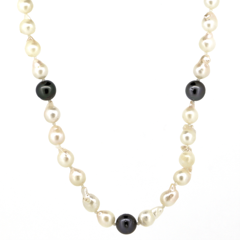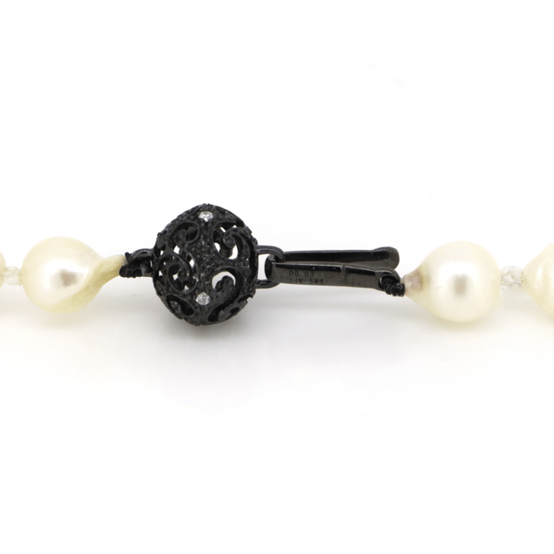 14K WHITE GOLD, BLACK CULTURED TAHITIAN/WHITE CULTURED FRESHWATER PEARL AND DIAMOND, STRAND NECKLACE. The Design Features, 3 Near Round, Black With Silver, Green And Purple Overtones, Cultured Tahitian Pearls (8.2Mm-8.5Mm, Good Lustre, Slight Blemishes). Encompassing The Design Are, 50 Round, White With Silver And Gold Overtones, Cultured Freshwater Pearls (6.2Mm-7.0Mm, Good Lustre, Slight Blemishes), Strung In A Single Row. Embellishing The 14K White Gold Filigree Ball Clasp Are, 4 Round Brilliant Cut, Diamonds (0.03Ct Tdw, H Colour, Si-I1 Clarity), Bead Set. Necklace Length Is 45Cm. Valuations Provided by an Independent Third-Party Professional Not Directly Associated With Lloyds Auctions at AUD $$7,300.00This valuation has been conducted by an independent third-party professional. The valuation amount is an assessment by the issuing valuer and does not reflect the auction value of the item. Any inquiries regarding the valuation should be directed to the issuing valuer (refer to contact details on the certificate), as Lloyds Auctions has no affiliation or influence over the valuation, the valuer, or the stated amount. Condition: Good - Refer Images 0645909+1632