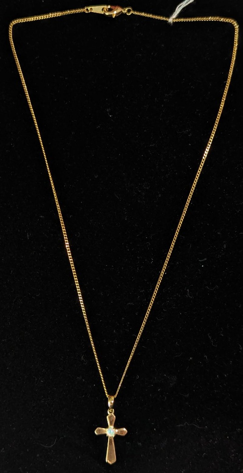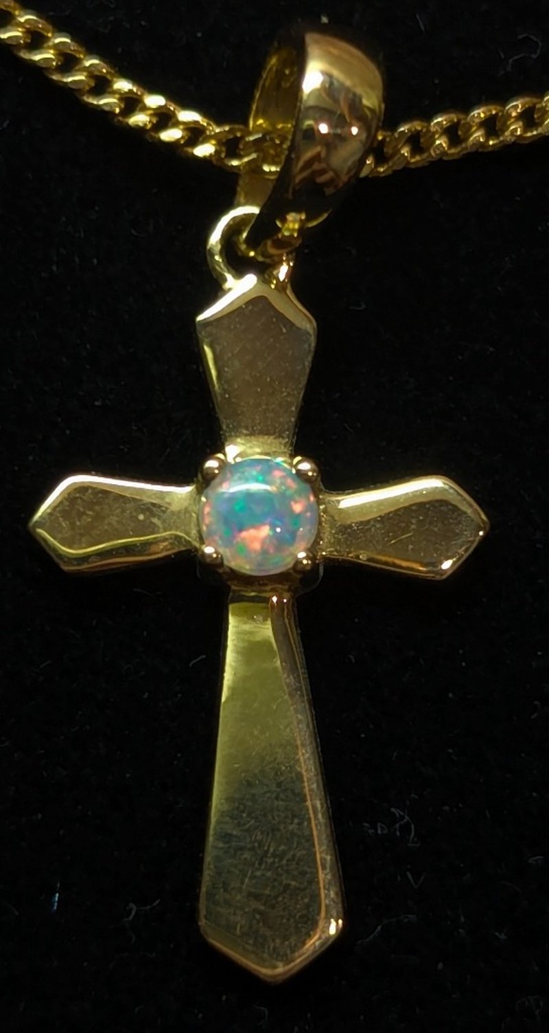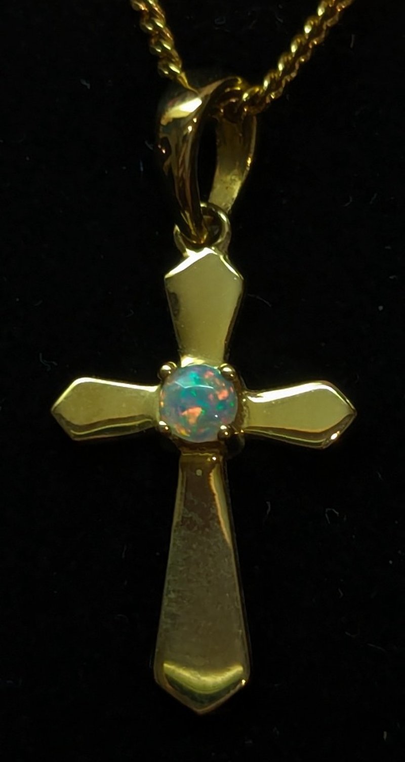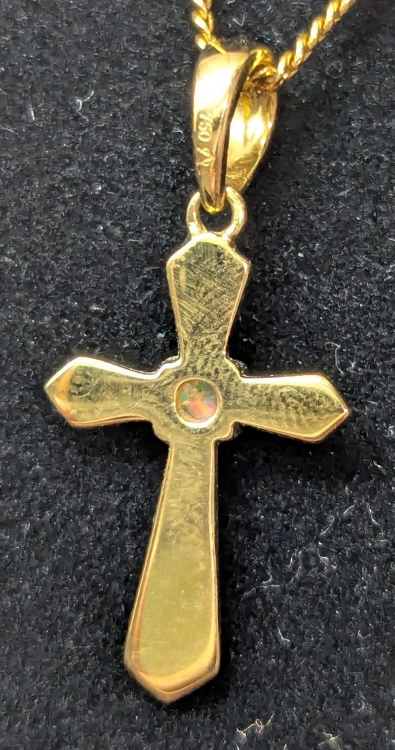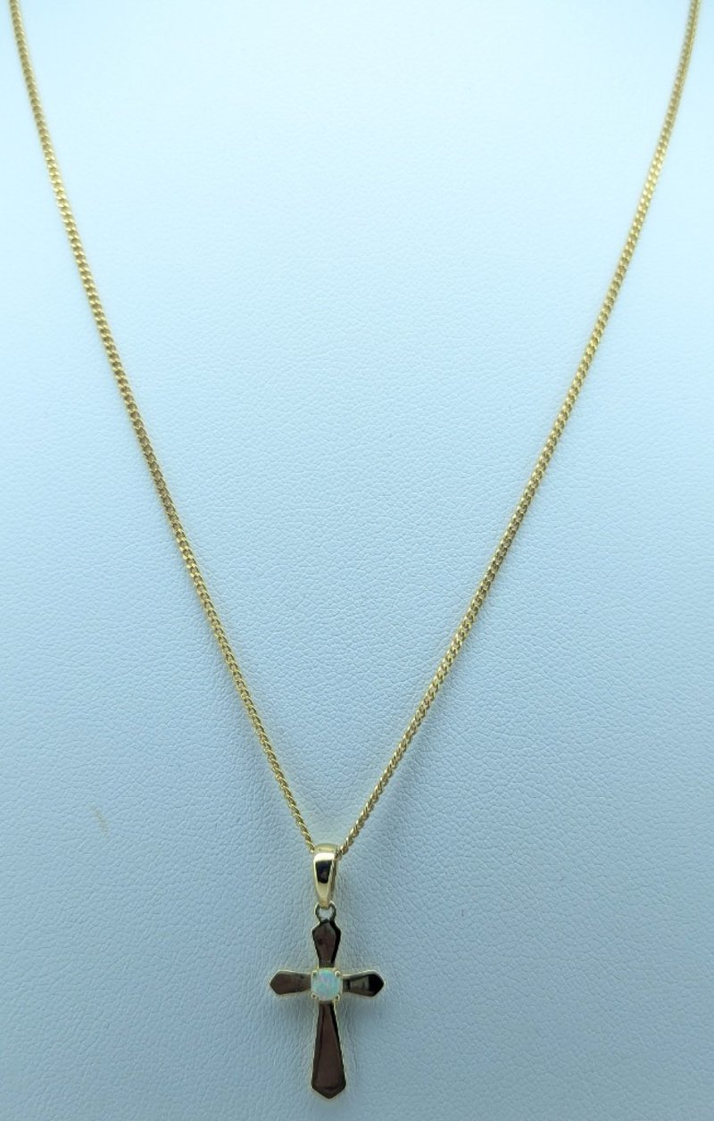 18K YELLOW GOLD OPAL CROSS PENDANT NECKLACECross Pendant Features 0.07Ct Round Cut Opal In Centre Four Claw Setting,Pendant Size: 2.5Cm X 1.5CmYellow Gold Plated Chain, Chain Length Approx: 40Cm (Unclasped)Total Item Weight: 3.31gMarkings: Stamped: 18K / 750Condition: Good - Refer To Images586318+25