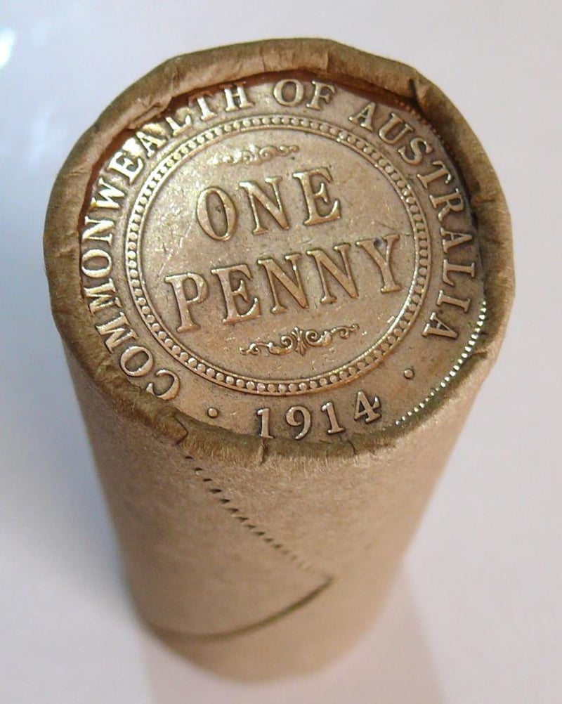 ROLL OF KGV AUSTRALIAN PENNY, UNKNOWN MIX YEARS, 1911-1937 (50X CIRCULATED COINS IN A ROLL).