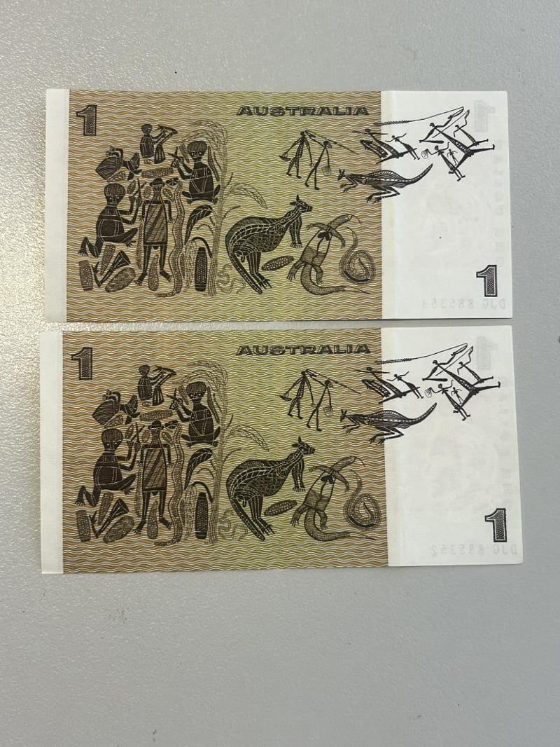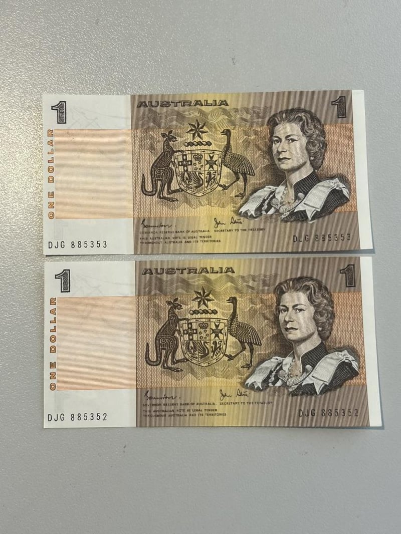 1982 ONE DOLLAR JOHNSTON-STONE CONSECUTIVE PAIR NOTES Serial Numbers Djg885352, Djg885353Condition: Refer Images 233488+70